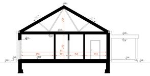 Ściany zewnętrzne: szkielet drewniany. Strop: drewniany - dźwigar dachowy. Konstrukcja dachu: dźwigar dachowy. Pokrycie dachu: blacha ocynkowana na rąbek. Elewacja: tynk cienkowarstwowy, drewno lub panele drewnopodobne. Ogrzewanie: piec gazowy