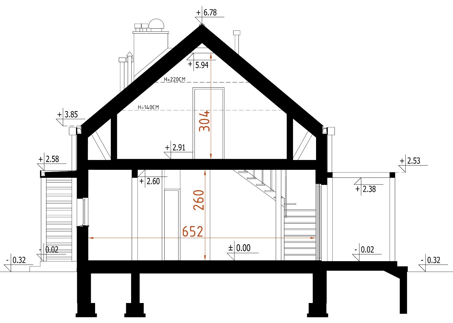 Ściany zewnętrzne: drewniane z ociepleniem. Strop: drewniany - dźwigar dachowy. Konstrukcja dachu: dźwigar dachowy. Pokrycie dachu: blacha ocynkowana na rąbek. Elewacja: tynk cienkowarstwowy, drewno. Ogrzewanie: piec gazowy EP70 kWh/m2.rok Projekt zgodny z Wt2021.
