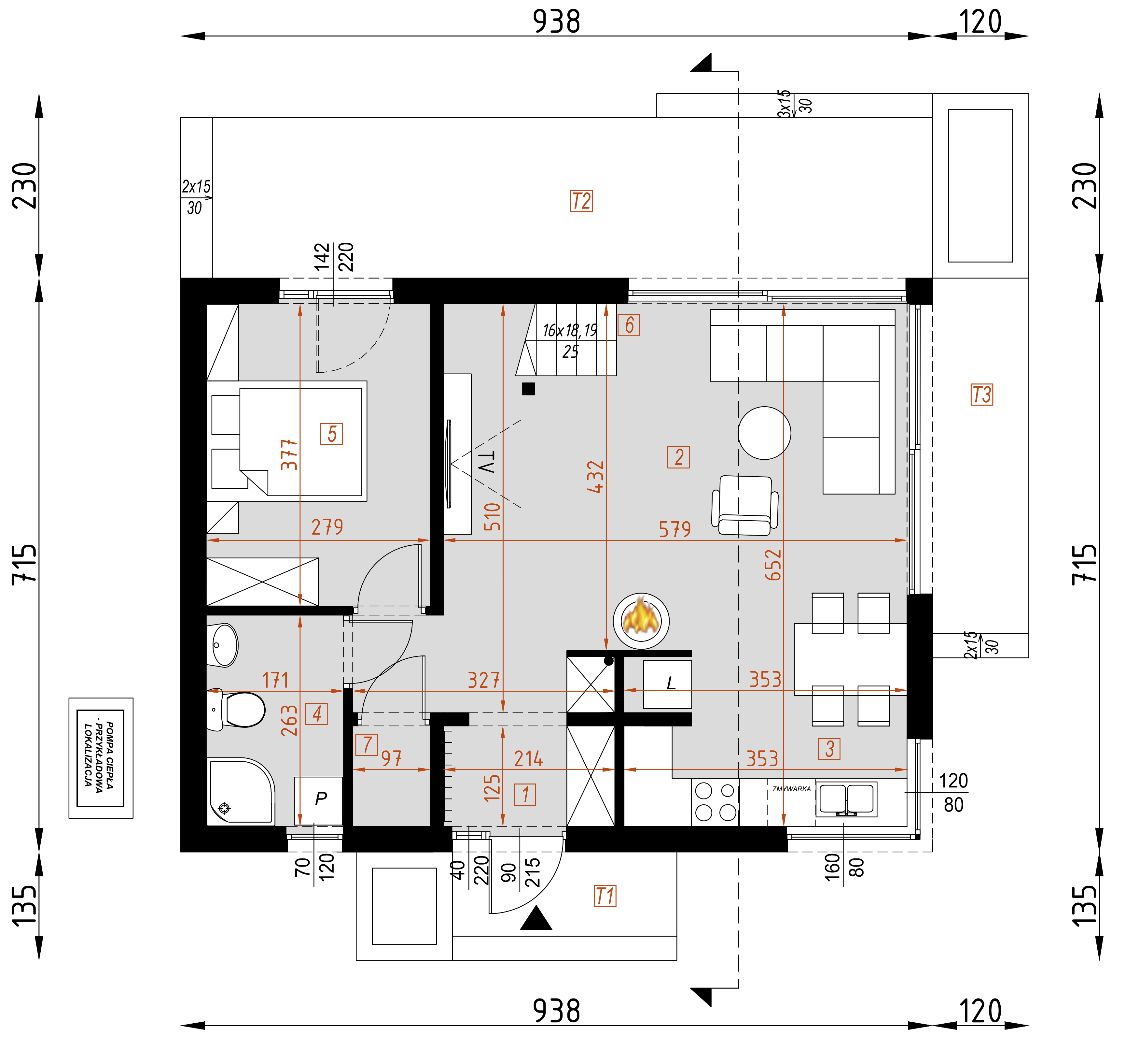Graficzne opracowanie rzutów poglądowych widocznych na karcie projektu zostało wykonane przez Extradom.pl. Prezentowane przez Extradom.pl wizualizacje wykonane zostały przez autora projektu i należy poczytywać je jedynie za przykład i propozycję wykończenia, wizję architektoniczną autora projektu. Ostateczne wykończenie budynku może nastąpić na wiele sposobów. Szczegółowe rozwiązania zastosowane w oferowanej dokumentacji - w tym również ilość, lokalizacje i wygląd okien, drzwi, kominów - mogą w niewielkim stopniu różnić się od prezentowanej wizualizacji budynku.