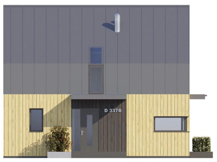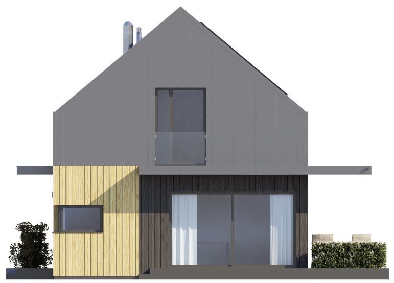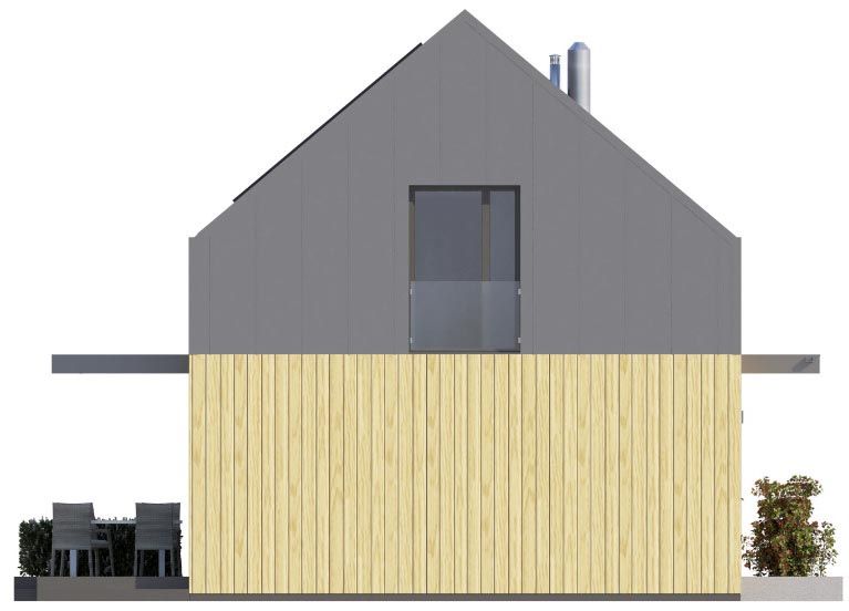 Ściany zewnętrzne: drewniane z ociepleniem. Strop: drewniany - belki. Konstrukcja dachu: krokwiowo-jętkowy. Pokrycie dachu: blacha ocynkowana na rąbek. Elewacja: tynk cienkowarstwowy, drewno. Ogrzewanie: pompa ciepła+rekuperacja EP70 kWh/m2.rok Projekt zgodny z Wt2021.