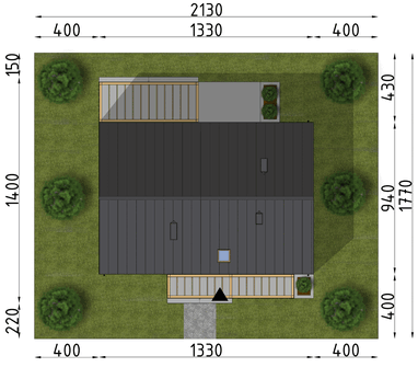 Graficzne opracowanie rzutów poglądowych widocznych na karcie projektu zostało wykonane przez Extradom.pl. Prezentowane przez Extradom.pl wizualizacje wykonane zostały przez autora projektu i należy poczytywać je jedynie za przykład i propozycję wykończenia, wizję architektoniczną autora projektu. Ostateczne wykończenie budynku może nastąpić na wiele sposobów. Szczegółowe rozwiązania zastosowane w oferowanej dokumentacji - w tym również ilość, lokalizacje i wygląd okien, drzwi, kominów - mogą w niewielkim stopniu różnić się od prezentowanej wizualizacji budynku.