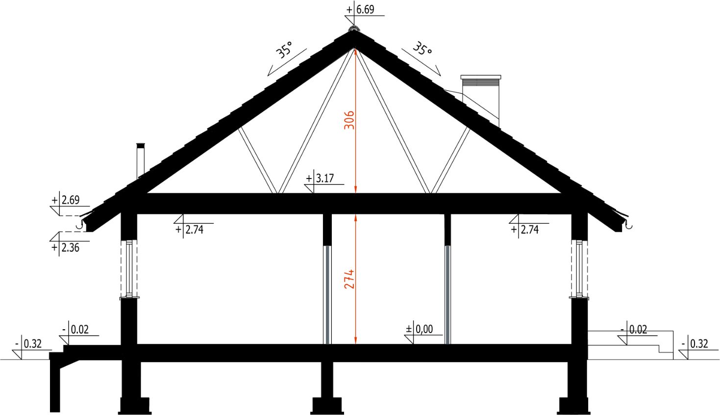 Ściany zewnętrzne: drewniane z ociepleniem. Strop: drewniany - wiązary. Konstrukcja dachu: pas górny wiązara. Pokrycie dachu: blacha ocynkowana na rąbek. Elewacja: tynk cienkowarstwowy, drewno.