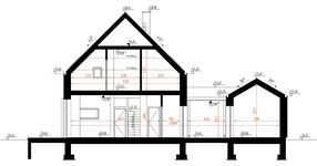 ściany zewnętrzne: murowane z ociepleniem. Ściany wewnętrzne: murowane. Strop: żelbetowy. Pokrycie dachu: blacha kąt nachylenia 45st, kąt nachylenia daszku garażu 30st elewacje: płyty kamienne, płyty cementowo-drzazgowe oraz blacha ogrzewanie gazowe.