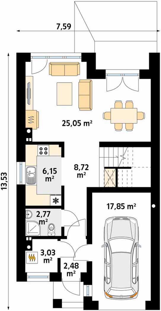 Graficzne opracowanie rzutów poglądowych widocznych na karcie projektu zostało wykonane przez Extradom.pl. Prezentowane przez Extradom.pl wizualizacje wykonane zostały przez autora projektu i należy poczytywać je jedynie za przykład i propozycję wykończenia, wizję architektoniczną autora projektu. Ostateczne wykończenie budynku może nastąpić na wiele sposobów. Szczegółowe rozwiązania zastosowane w oferowanej dokumentacji - w tym również ilość, lokalizacje i wygląd okien, drzwi, kominów - mogą w niewielkim stopniu różnić się od prezentowanej wizualizacji budynku.