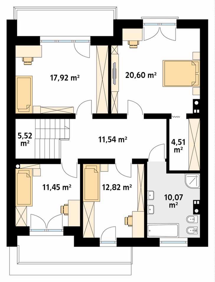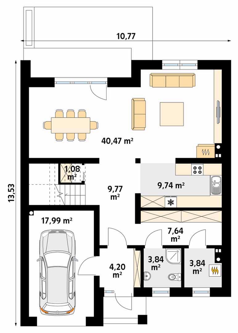 Graficzne opracowanie rzutów poglądowych widocznych na karcie projektu zostało wykonane przez Extradom.pl. Prezentowane przez Extradom.pl wizualizacje wykonane zostały przez autora projektu i należy poczytywać je jedynie za przykład i propozycję wykończenia, wizję architektoniczną autora projektu. Ostateczne wykończenie budynku może nastąpić na wiele sposobów. Szczegółowe rozwiązania zastosowane w oferowanej dokumentacji - w tym również ilość, lokalizacje i wygląd okien, drzwi, kominów - mogą w niewielkim stopniu różnić się od prezentowanej wizualizacji budynku.