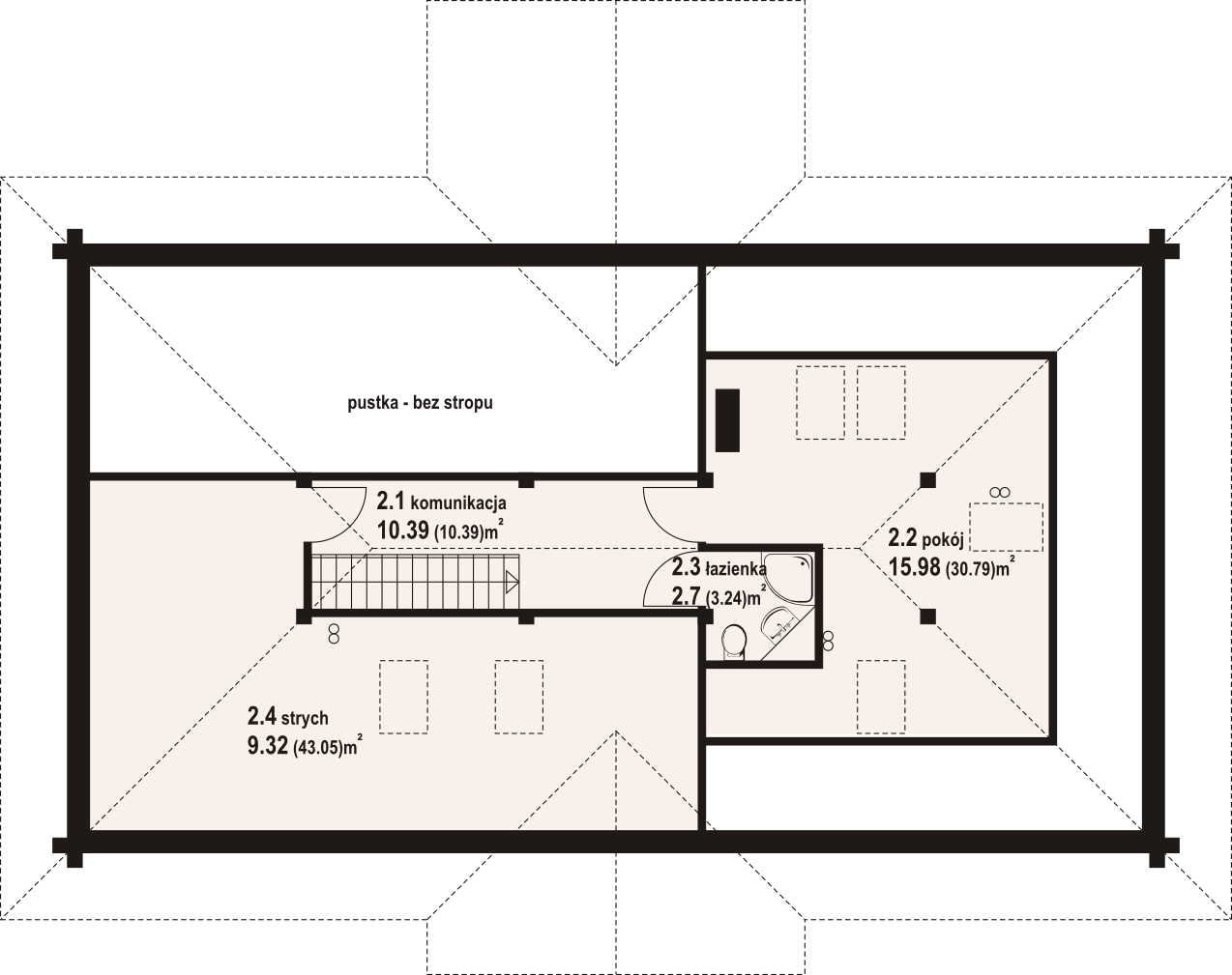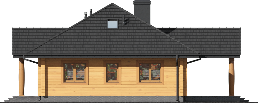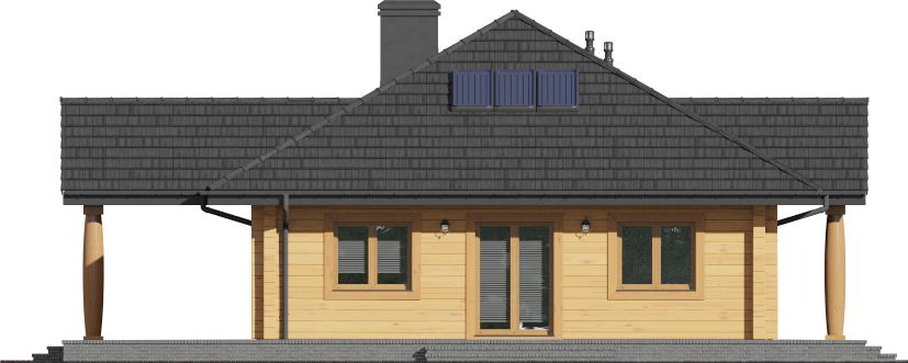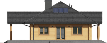 Wysokość ścianki kolankowej: 0.32 m. Strop: drewniany. Pokrycie dachu: dachówka gontopodobna Gerard Corona. Ściany zewnętrzne: płazy drewniane + wełna mineralna + deska. Ściany wewnętrzne: płazy drewniane. Typ ogrzewania: kocioł gazowy. Instalacje dodatkowe: instalacja solarna. Inne: okna połaciowe Velux.