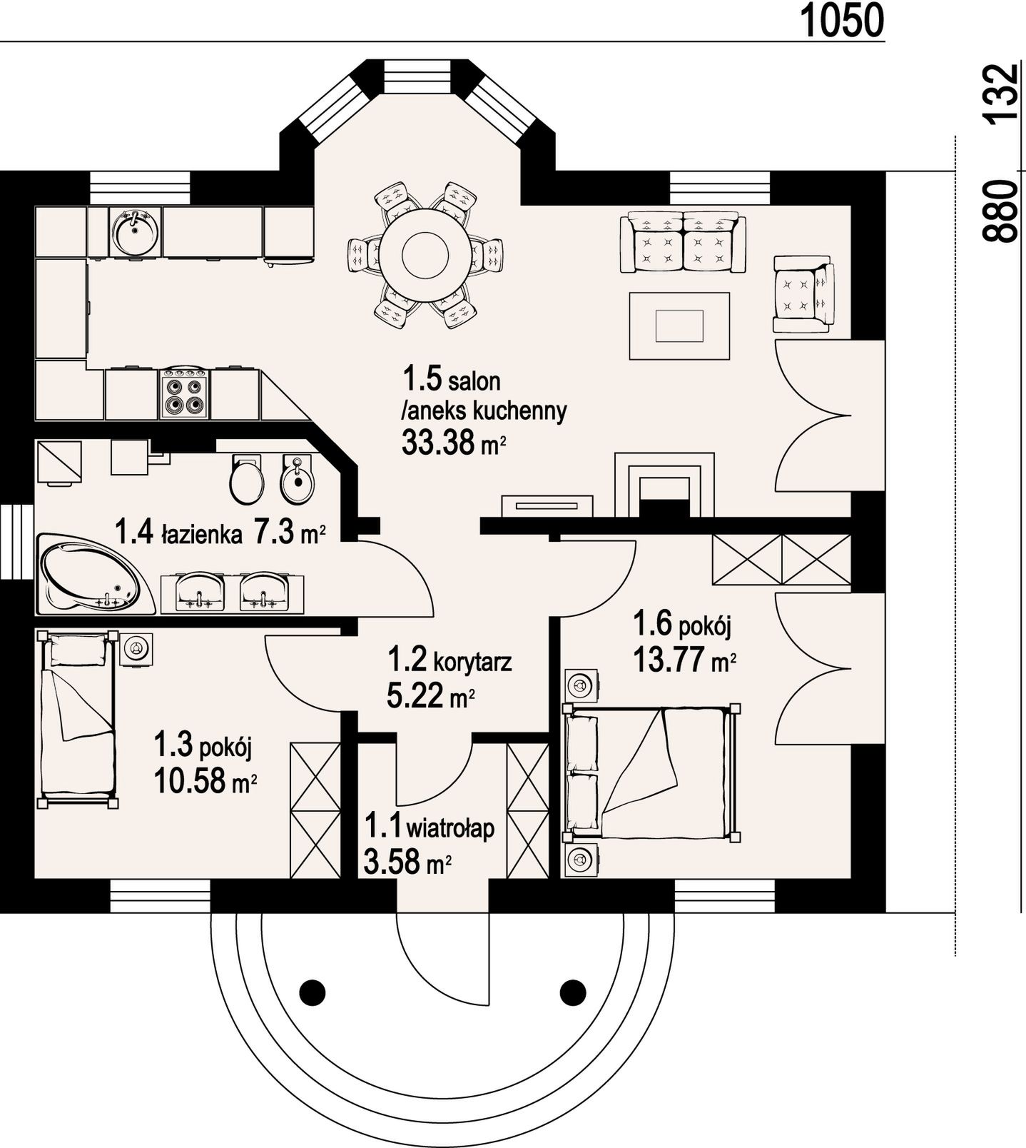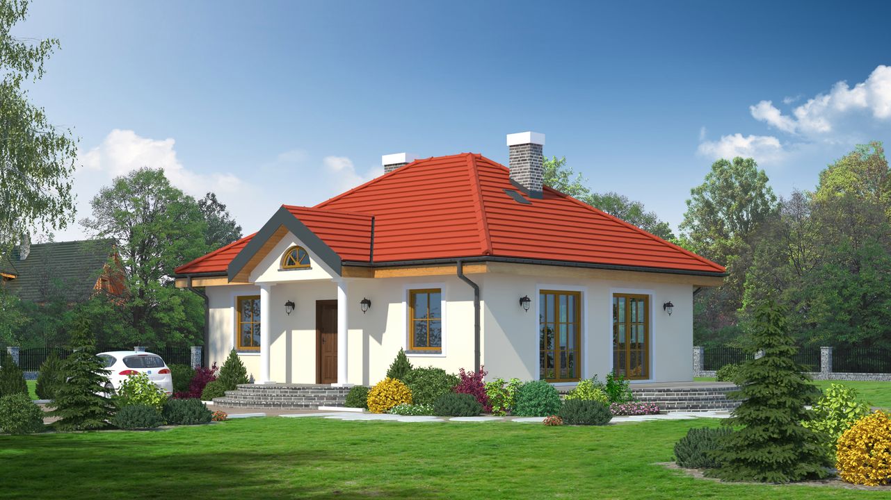 Graficzne opracowanie rzutów poglądowych widocznych na karcie projektu zostało wykonane przez Extradom.pl. Prezentowane przez Extradom.pl wizualizacje wykonane zostały przez autora projektu i należy poczytywać je jedynie za przykład i propozycję wykończenia, wizję architektoniczną autora projektu. Ostateczne wykończenie budynku może nastąpić na wiele sposobów. Szczegółowe rozwiązania zastosowane w oferowanej dokumentacji - w tym również ilość, lokalizacje i wygląd okien, drzwi, kominów - mogą w niewielkim stopniu różnić się od prezentowanej wizualizacji budynku.