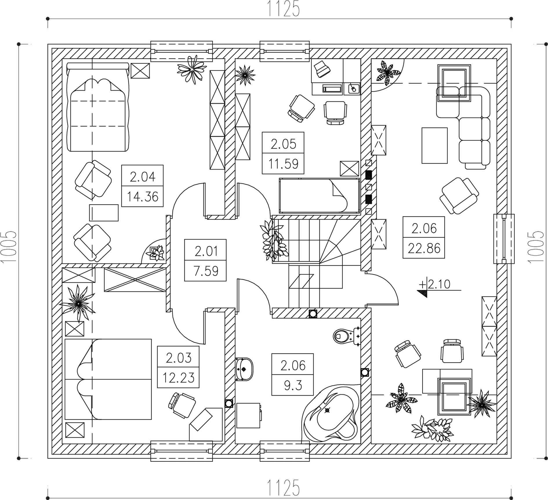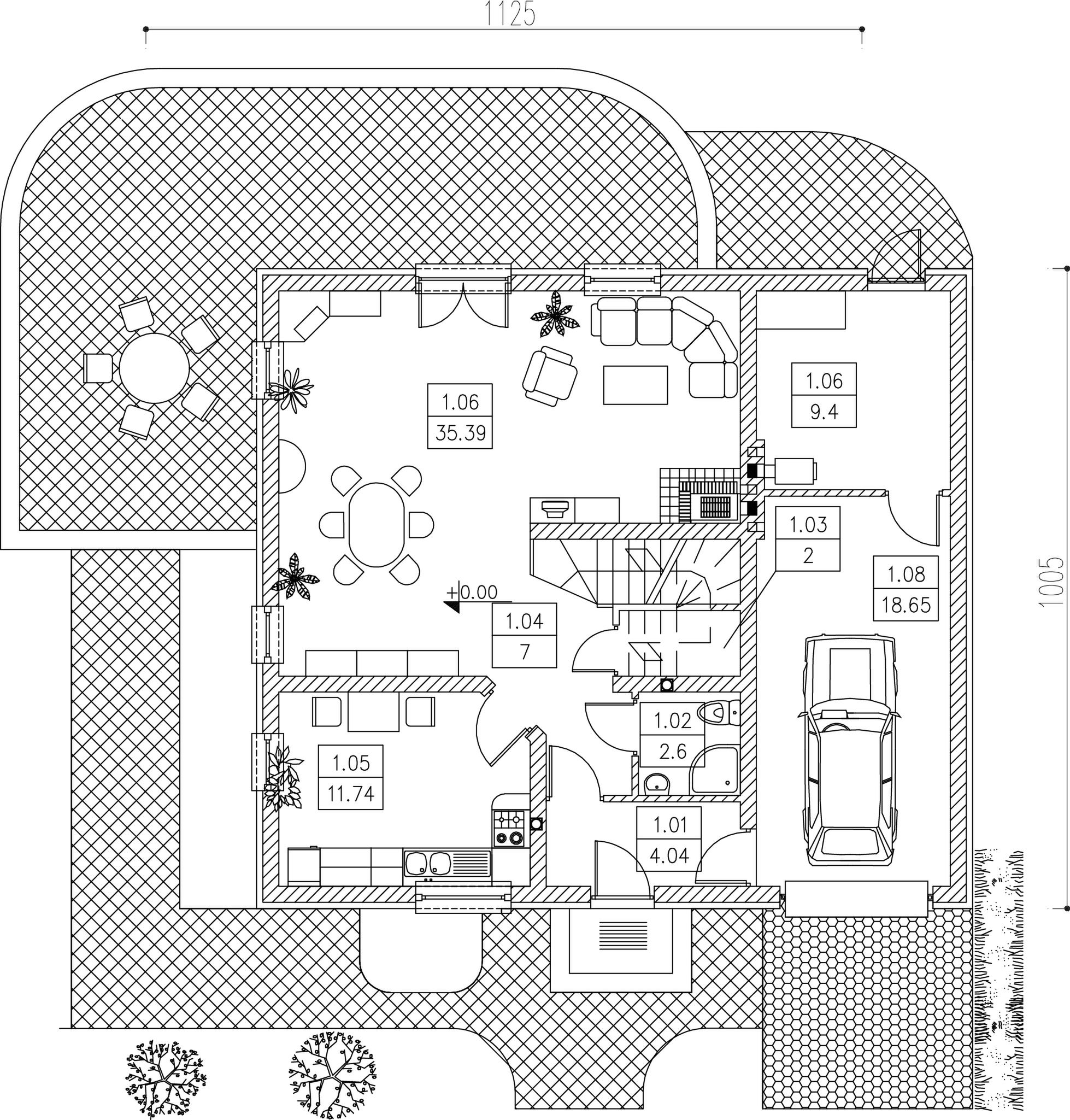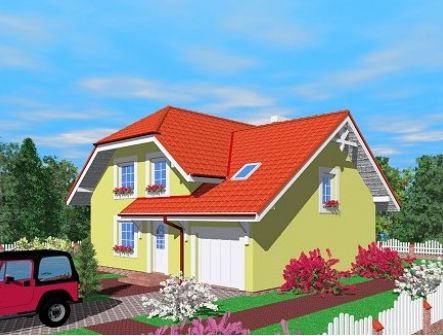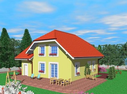 Graficzne opracowanie rzutów poglądowych widocznych na karcie projektu zostało wykonane przez Extradom.pl. Prezentowane przez Extradom.pl wizualizacje wykonane zostały przez autora projektu i należy poczytywać je jedynie za przykład i propozycję wykończenia, wizję architektoniczną autora projektu. Ostateczne wykończenie budynku może nastąpić na wiele sposobów. Szczegółowe rozwiązania zastosowane w oferowanej dokumentacji - w tym również ilość, lokalizacje i wygląd okien, drzwi, kominów - mogą w niewielkim stopniu różnić się od prezentowanej wizualizacji budynku.