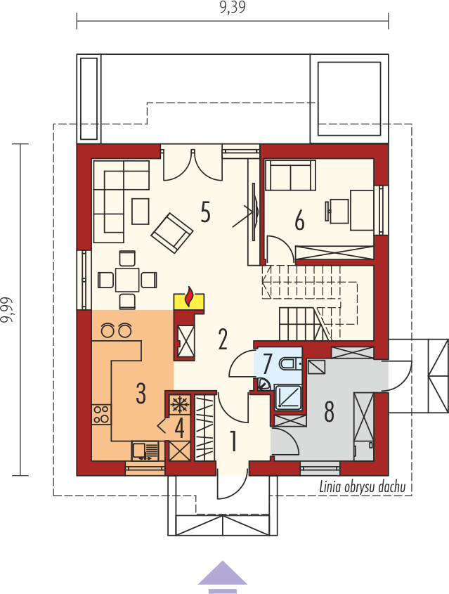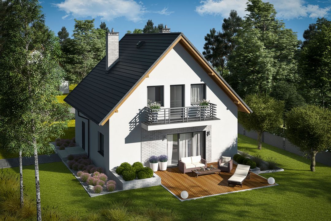 Graficzne opracowanie rzutów poglądowych widocznych na karcie projektu zostało wykonane przez Extradom.pl. Prezentowane przez Extradom.pl wizualizacje wykonane zostały przez autora projektu i należy poczytywać je jedynie za przykład i propozycję wykończenia, wizję architektoniczną autora projektu. Ostateczne wykończenie budynku może nastąpić na wiele sposobów. Szczegółowe rozwiązania zastosowane w oferowanej dokumentacji - w tym również ilość, lokalizacje i wygląd okien, drzwi, kominów - mogą w niewielkim stopniu różnić się od prezentowanej wizualizacji budynku.
