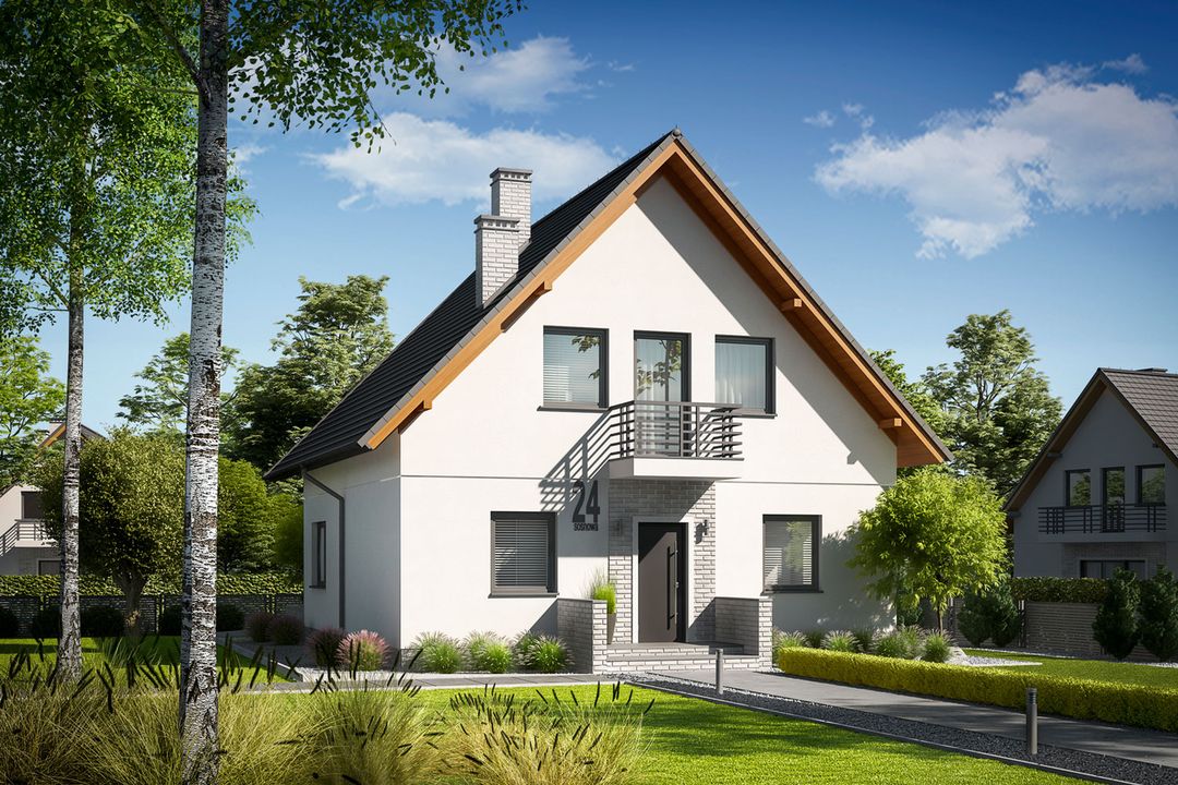 Dom Daga II charakteryzuje się prostą, zwartą bryłą przykrytą klasycznym dachem dwuspadowym, co jest rozwiązaniem sprawdzonym, estetycznym i ekonomicznym w realizacji. Tradycyjny styl budynku podkreślają klasyczne okapy oraz harmonijna kompozycja elewacji. Projekt wzbogacono o przestronny taras, który stanowi naturalne przedłużenie strefy dziennej i zaprasza do wypoczynku na świeżym powietrzu. Dopełnieniem całości jest balkon na poddaszu, a dodatkowe światło do wnętrz wprowadza okno dachowe.
