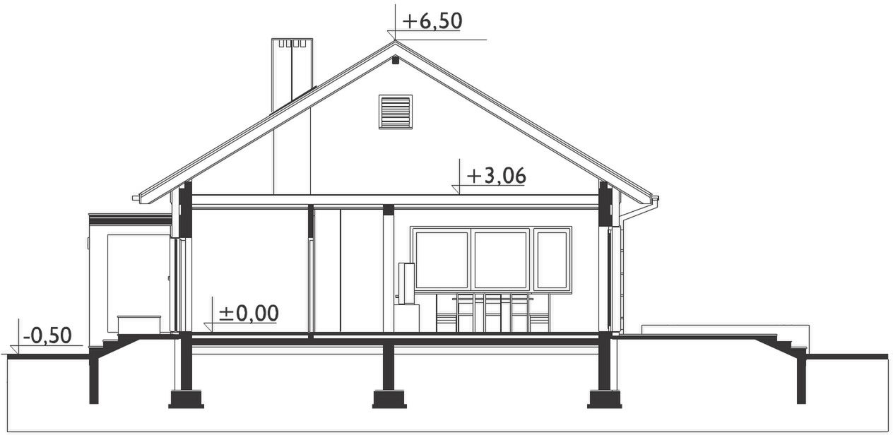 Wersja technologiczna: murowana - beton komórkowy. Strop: żelbetowy monolityczny. Typ schodów: brak. Konstrukcja dachu: drewniana krokwiowo-jętkowa. Typ ogrzewania: Kocioł na gaz. Możliwość adaptacji do paliwa stałego: Tak. Dostępna wersja z pompą ciepła: Tak. Ściany zewnętrzne: 30 cm beton komórkowy. Ściany wewnętrzne: 24 cm beton komórkowy. Ściany wewnętrzne działowe: 11 cm beton komórkowy.