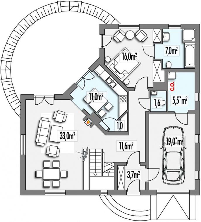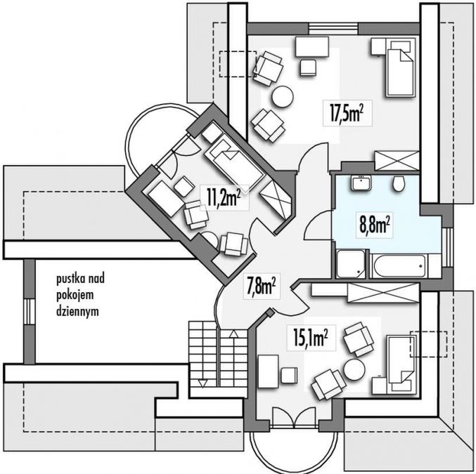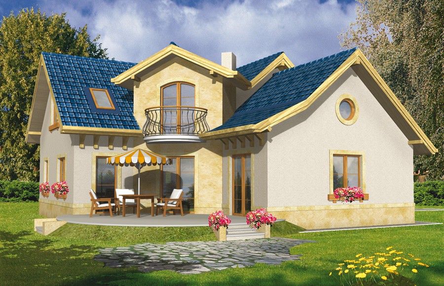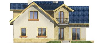 Graficzne opracowanie rzutów poglądowych widocznych na karcie projektu zostało wykonane przez Extradom.pl. Prezentowane przez Extradom.pl wizualizacje wykonane zostały przez autora projektu i należy poczytywać je jedynie za przykład i propozycję wykończenia, wizję architektoniczną autora projektu. Ostateczne wykończenie budynku może nastąpić na wiele sposobów. Szczegółowe rozwiązania zastosowane w oferowanej dokumentacji - w tym również ilość, lokalizacje i wygląd okien, drzwi, kominów - mogą w niewielkim stopniu różnić się od prezentowanej wizualizacji budynku.