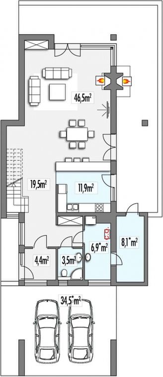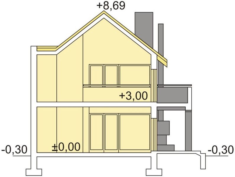 Graficzne opracowanie rzutów poglądowych widocznych na karcie projektu zostało wykonane przez Extradom.pl. Prezentowane przez Extradom.pl wizualizacje wykonane zostały przez autora projektu i należy poczytywać je jedynie za przykład i propozycję wykończenia, wizję architektoniczną autora projektu. Ostateczne wykończenie budynku może nastąpić na wiele sposobów. Szczegółowe rozwiązania zastosowane w oferowanej dokumentacji - w tym również ilość, lokalizacje i wygląd okien, drzwi, kominów - mogą w niewielkim stopniu różnić się od prezentowanej wizualizacji budynku.
