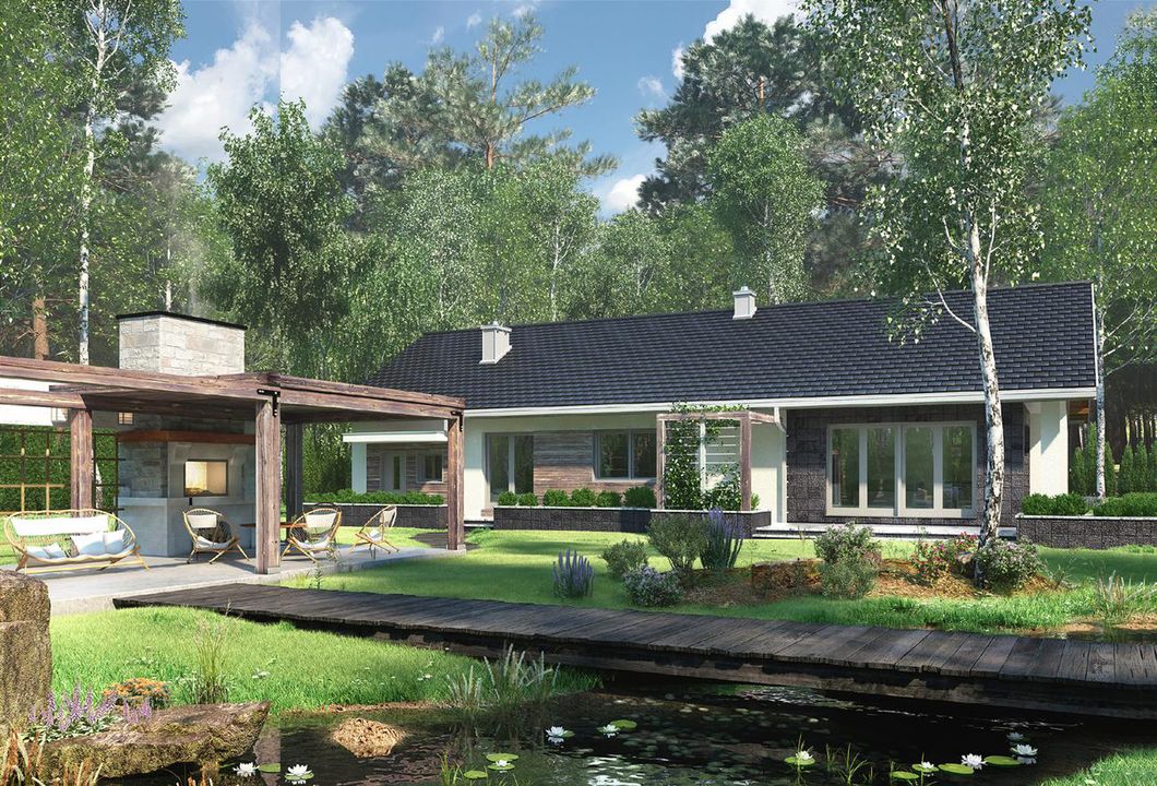 Graficzne opracowanie rzutów poglądowych widocznych na karcie projektu zostało wykonane przez Extradom.pl. Prezentowane przez Extradom.pl wizualizacje wykonane zostały przez autora projektu i należy poczytywać je jedynie za przykład i propozycję wykończenia, wizję architektoniczną autora projektu. Ostateczne wykończenie budynku może nastąpić na wiele sposobów. Szczegółowe rozwiązania zastosowane w oferowanej dokumentacji - w tym również ilość, lokalizacje i wygląd okien, drzwi, kominów - mogą w niewielkim stopniu różnić się od prezentowanej wizualizacji budynku.