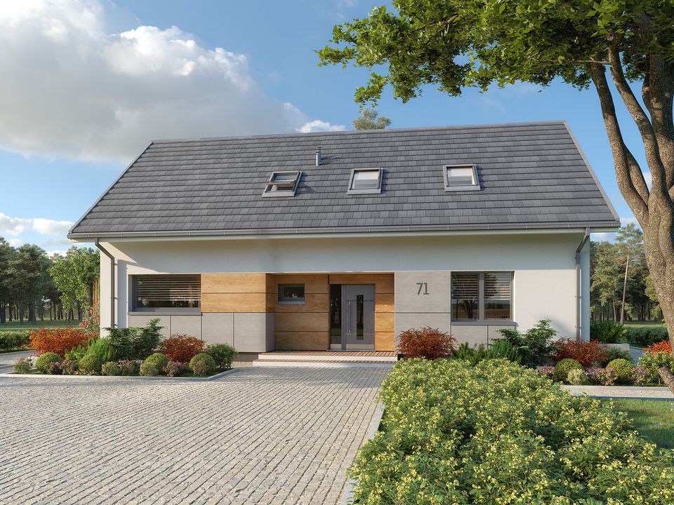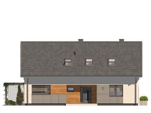 Graficzne opracowanie rzutów poglądowych widocznych na karcie projektu zostało wykonane przez Extradom.pl. Prezentowane przez Extradom.pl wizualizacje wykonane zostały przez autora projektu i należy poczytywać je jedynie za przykład i propozycję wykończenia, wizję architektoniczną autora projektu. Ostateczne wykończenie budynku może nastąpić na wiele sposobów. Szczegółowe rozwiązania zastosowane w oferowanej dokumentacji - w tym również ilość, lokalizacje i wygląd okien, drzwi, kominów - mogą w niewielkim stopniu różnić się od prezentowanej wizualizacji budynku.