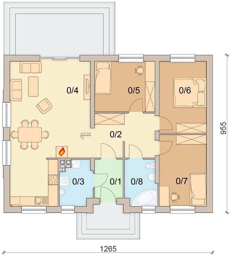 Graficzne opracowanie rzutów poglądowych widocznych na karcie projektu zostało wykonane przez Extradom.pl. Prezentowane przez Extradom.pl wizualizacje wykonane zostały przez autora projektu i należy poczytywać je jedynie za przykład i propozycję wykończenia, wizję architektoniczną autora projektu. Ostateczne wykończenie budynku może nastąpić na wiele sposobów. Szczegółowe rozwiązania zastosowane w oferowanej dokumentacji - w tym również ilość, lokalizacje i wygląd okien, drzwi, kominów - mogą w niewielkim stopniu różnić się od prezentowanej wizualizacji budynku.