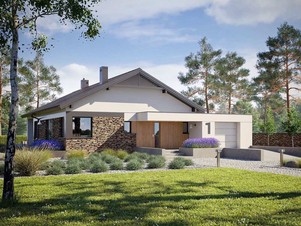 Ściany zewnętrzne: murowane, dwuwarstwowe, bloczki betonu komórkowego firmy H+H 24 cm, ocieplenie styropian Termo Organika 20 cm. Ściany wewnętrzne: nośne i działowe murowane, bloczki betonu komórkowego firmy H+H 24 cm i 12 cm. Strop i stropodach nad garażem: gęstożebrowy Teriva, stropodach pełny, ocieplenie wełna mineralna firmy ISOVER 30 cm. Dach: konstrukcja drewniana, blacha na rąbek stojący Classic firmy Ruukki, więźba dachowa dostępna również w systemie prefabrykacji drewnianej. Ogrzewanie: kocioł gazowy kondensacyjny, rozprowadzenie ciepła: grzejniki. Wentylacja: grawitacyjna. Elewacje: tynk cienkowarstwowy mineralny w kolorze TO-PA001 z palety firmy Termo Organika, okładzina drewniana i kamienna. Stolarka: drewniana, PVC lub aluminiowa, rolety zewnętrzne w systemie CleverBox firmy BeClever, drzwi wejściowe i brama garażowa firmy Hörmann. Otoczenie: płyty tarasowe firmy Libet, system tarasowy ProDeck - deska kompozytowa Terra w kolorze orzech.