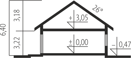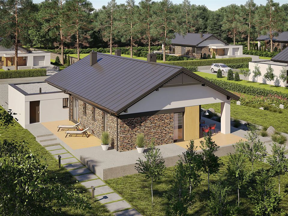 Graficzne opracowanie rzutów poglądowych widocznych na karcie projektu zostało wykonane przez Extradom.pl. Prezentowane przez Extradom.pl wizualizacje wykonane zostały przez autora projektu i należy poczytywać je jedynie za przykład i propozycję wykończenia, wizję architektoniczną autora projektu. Ostateczne wykończenie budynku może nastąpić na wiele sposobów. Szczegółowe rozwiązania zastosowane w oferowanej dokumentacji - w tym również ilość, lokalizacje i wygląd okien, drzwi, kominów - mogą w niewielkim stopniu różnić się od prezentowanej wizualizacji budynku.