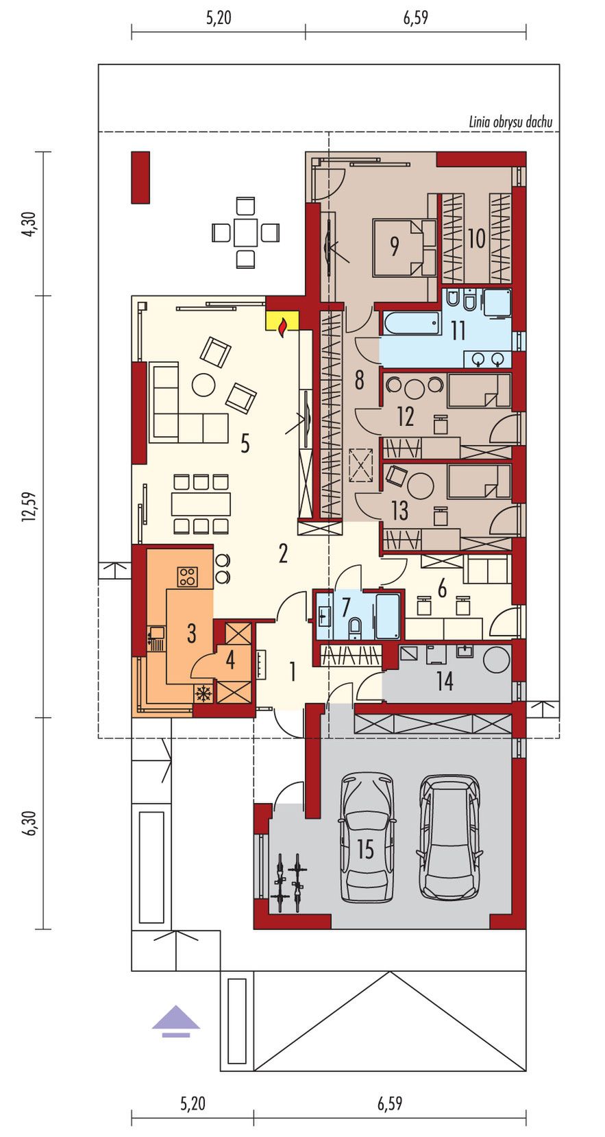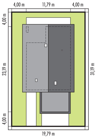 Graficzne opracowanie rzutów poglądowych widocznych na karcie projektu zostało wykonane przez Extradom.pl. Prezentowane przez Extradom.pl wizualizacje wykonane zostały przez autora projektu i należy poczytywać je jedynie za przykład i propozycję wykończenia, wizję architektoniczną autora projektu. Ostateczne wykończenie budynku może nastąpić na wiele sposobów. Szczegółowe rozwiązania zastosowane w oferowanej dokumentacji - w tym również ilość, lokalizacje i wygląd okien, drzwi, kominów - mogą w niewielkim stopniu różnić się od prezentowanej wizualizacji budynku.