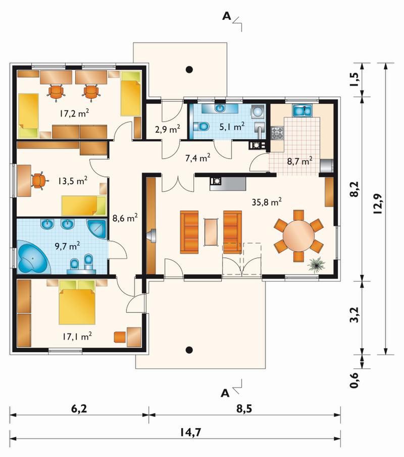 Graficzne opracowanie rzutów poglądowych widocznych na karcie projektu zostało wykonane przez Extradom.pl. Prezentowane przez Extradom.pl wizualizacje wykonane zostały przez autora projektu i należy poczytywać je jedynie za przykład i propozycję wykończenia, wizję architektoniczną autora projektu. Ostateczne wykończenie budynku może nastąpić na wiele sposobów. Szczegółowe rozwiązania zastosowane w oferowanej dokumentacji - w tym również ilość, lokalizacje i wygląd okien, drzwi, kominów - mogą w niewielkim stopniu różnić się od prezentowanej wizualizacji budynku.