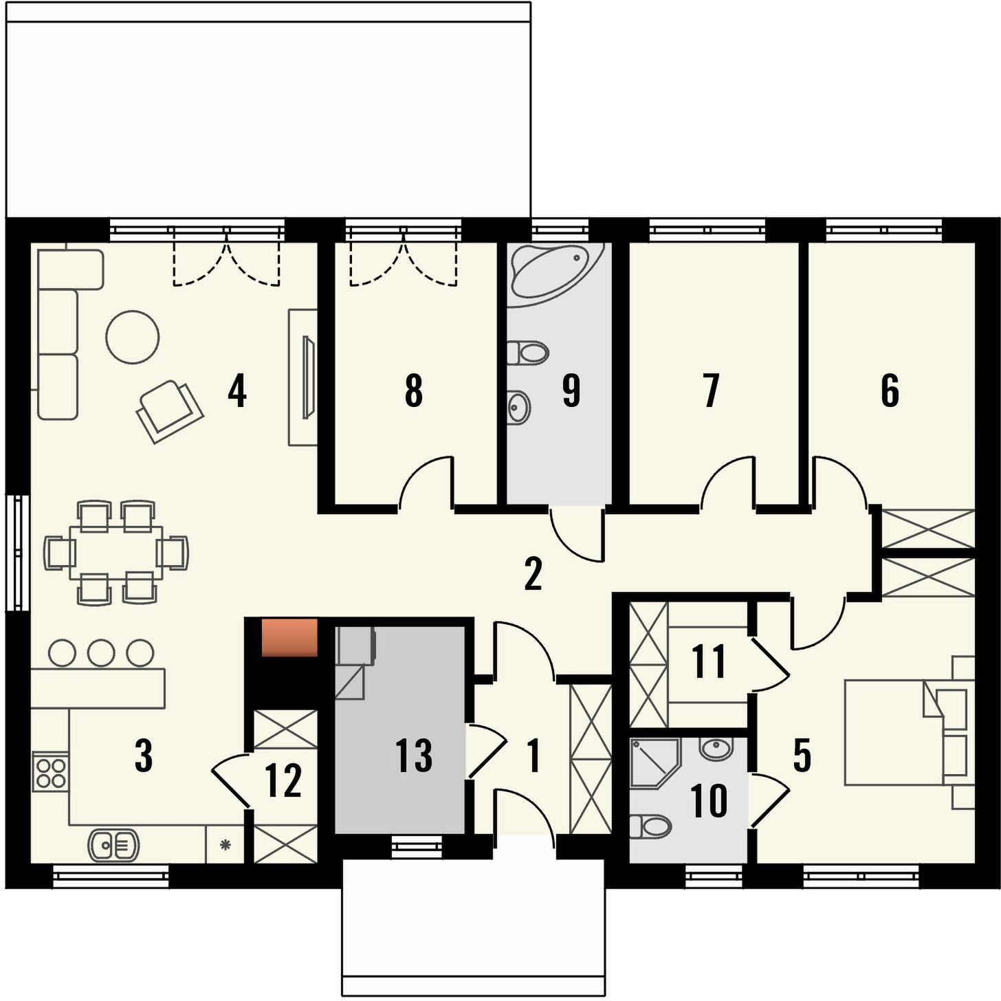 W wyraźnie oddzielonej strefie nocnej zaprojektowano trzy wygodne sypialnie. Znajduje się tu główna sypialnia z garderobą, a także dwa dodatkowe, ustawne pokoje, idealne dla dzieci lub do aranżacji domowego biura. Dopełnieniem programu funkcjonalnego jest ogólnodostępna łazienka, wiatrołap oraz pomieszczenie gospodarcze, które może pełnić funkcję kotłowni.
