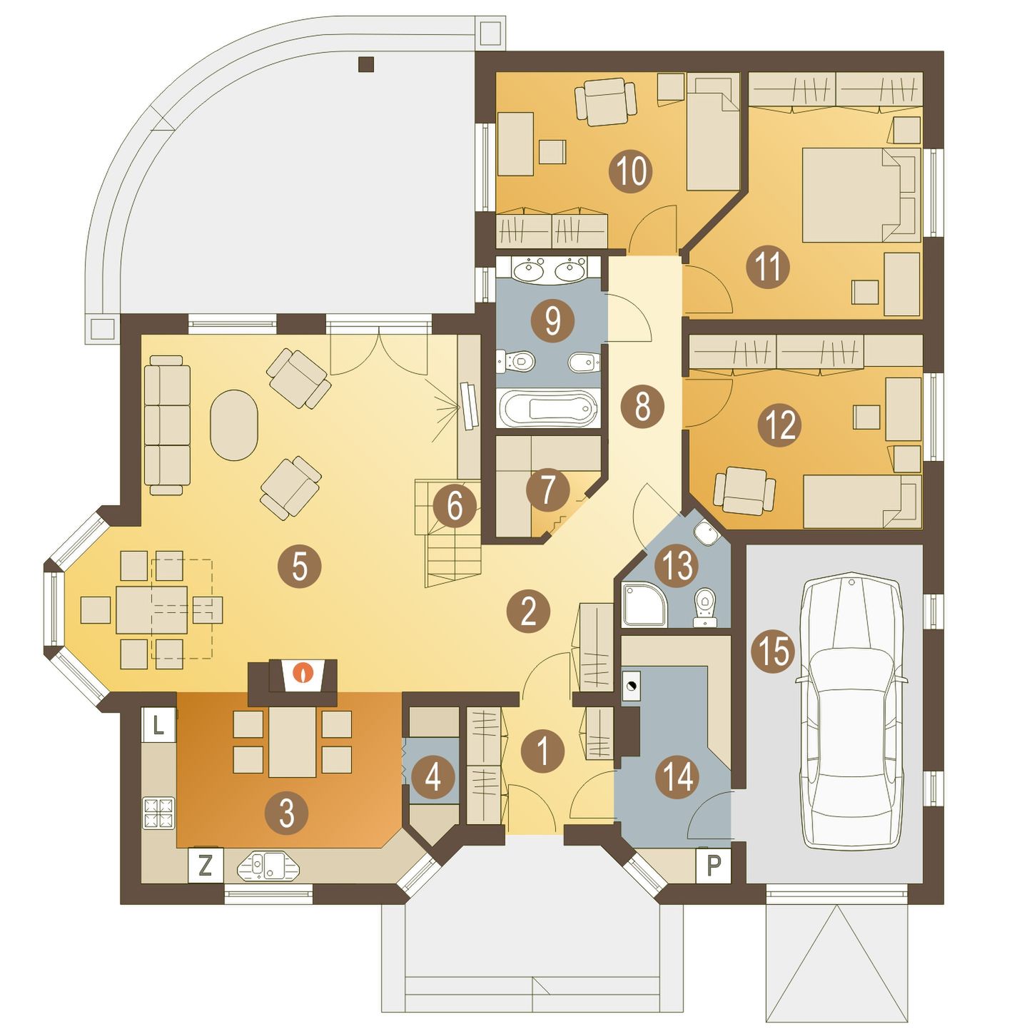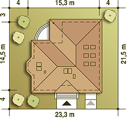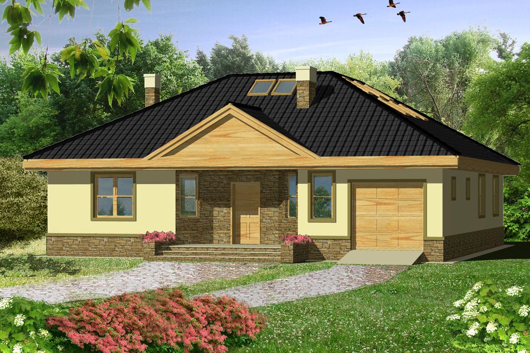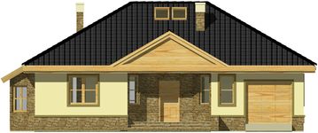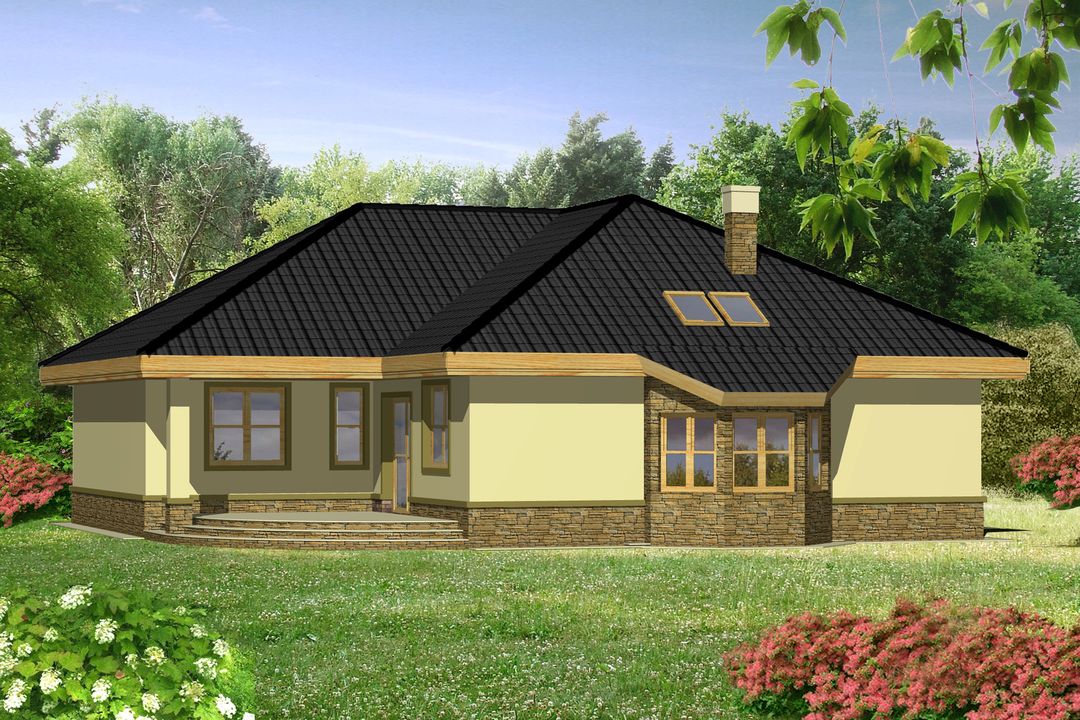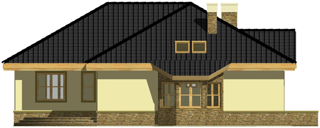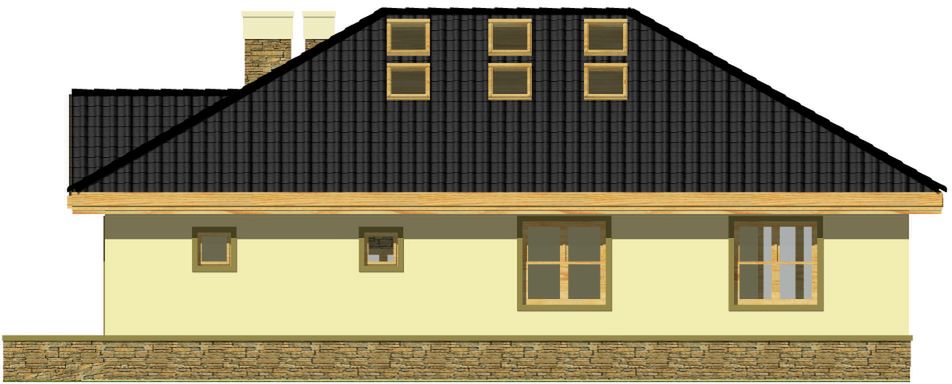 Graficzne opracowanie rzutów poglądowych widocznych na karcie projektu zostało wykonane przez Extradom.pl. Prezentowane przez Extradom.pl wizualizacje wykonane zostały przez autora projektu i należy poczytywać je jedynie za przykład i propozycję wykończenia, wizję architektoniczną autora projektu. Ostateczne wykończenie budynku może nastąpić na wiele sposobów. Szczegółowe rozwiązania zastosowane w oferowanej dokumentacji - w tym również ilość, lokalizacje i wygląd okien, drzwi, kominów - mogą w niewielkim stopniu różnić się od prezentowanej wizualizacji budynku.