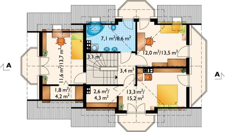 Graficzne opracowanie rzutów poglądowych widocznych na karcie projektu zostało wykonane przez Extradom.pl. Prezentowane przez Extradom.pl wizualizacje wykonane zostały przez autora projektu i należy poczytywać je jedynie za przykład i propozycję wykończenia, wizję architektoniczną autora projektu. Ostateczne wykończenie budynku może nastąpić na wiele sposobów. Szczegółowe rozwiązania zastosowane w oferowanej dokumentacji - w tym również ilość, lokalizacje i wygląd okien, drzwi, kominów - mogą w niewielkim stopniu różnić się od prezentowanej wizualizacji budynku.