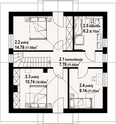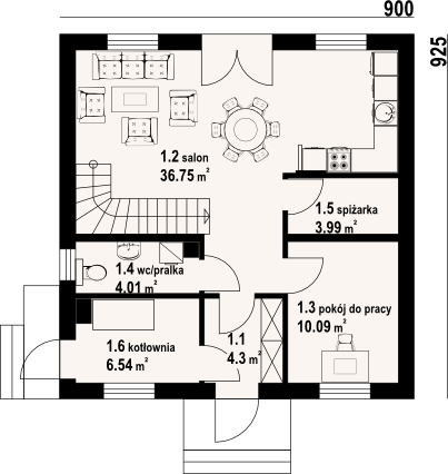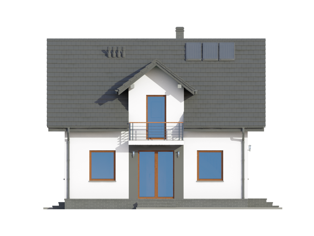 Graficzne opracowanie rzutów poglądowych widocznych na karcie projektu zostało wykonane przez Extradom.pl. Prezentowane przez Extradom.pl wizualizacje wykonane zostały przez autora projektu i należy poczytywać je jedynie za przykład i propozycję wykończenia, wizję architektoniczną autora projektu. Ostateczne wykończenie budynku może nastąpić na wiele sposobów. Szczegółowe rozwiązania zastosowane w oferowanej dokumentacji - w tym również ilość, lokalizacje i wygląd okien, drzwi, kominów - mogą w niewielkim stopniu różnić się od prezentowanej wizualizacji budynku.
