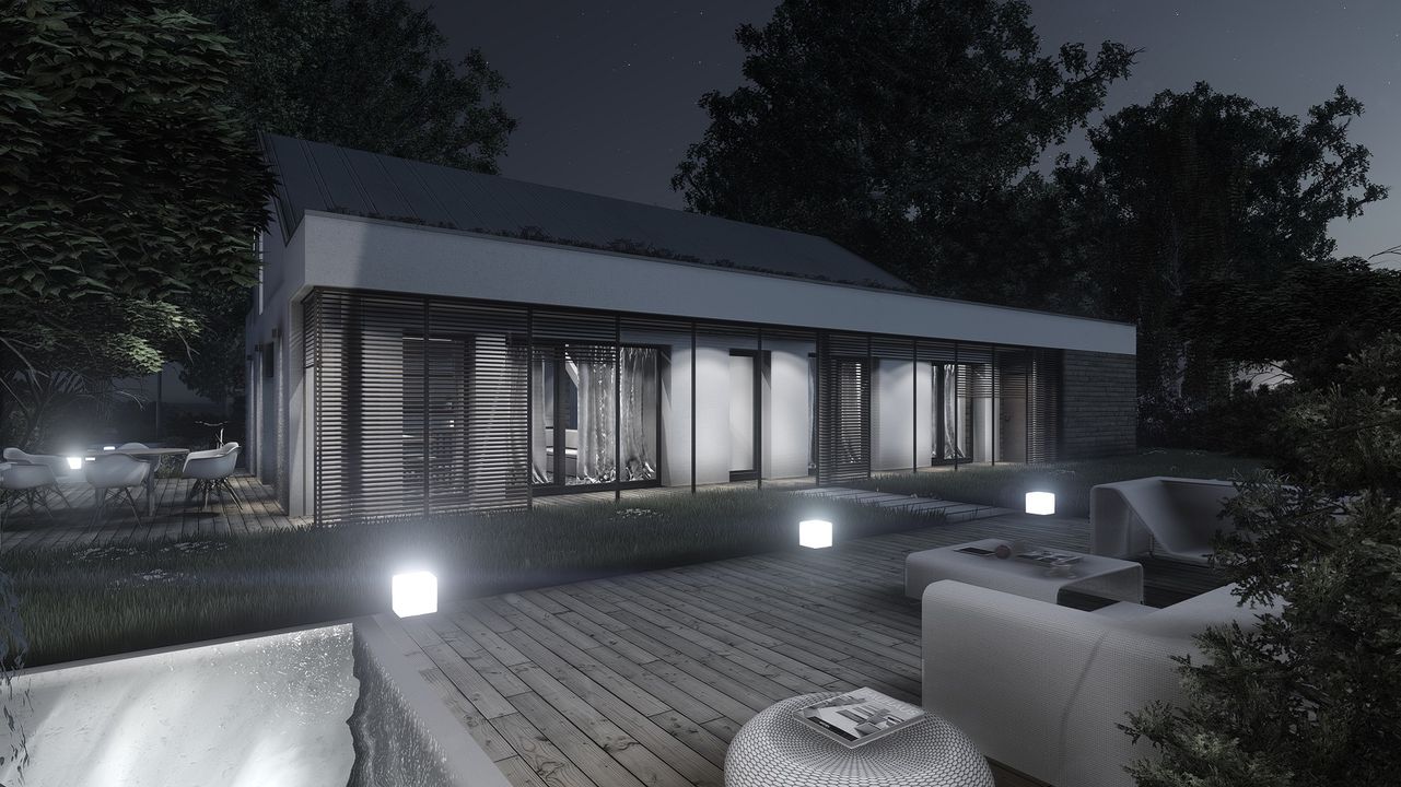 Graficzne opracowanie rzutów poglądowych widocznych na karcie projektu zostało wykonane przez Extradom.pl. Prezentowane przez Extradom.pl wizualizacje wykonane zostały przez autora projektu i należy poczytywać je jedynie za przykład i propozycję wykończenia, wizję architektoniczną autora projektu. Ostateczne wykończenie budynku może nastąpić na wiele sposobów. Szczegółowe rozwiązania zastosowane w oferowanej dokumentacji - w tym również ilość, lokalizacje i wygląd okien, drzwi, kominów - mogą w niewielkim stopniu różnić się od prezentowanej wizualizacji budynku.