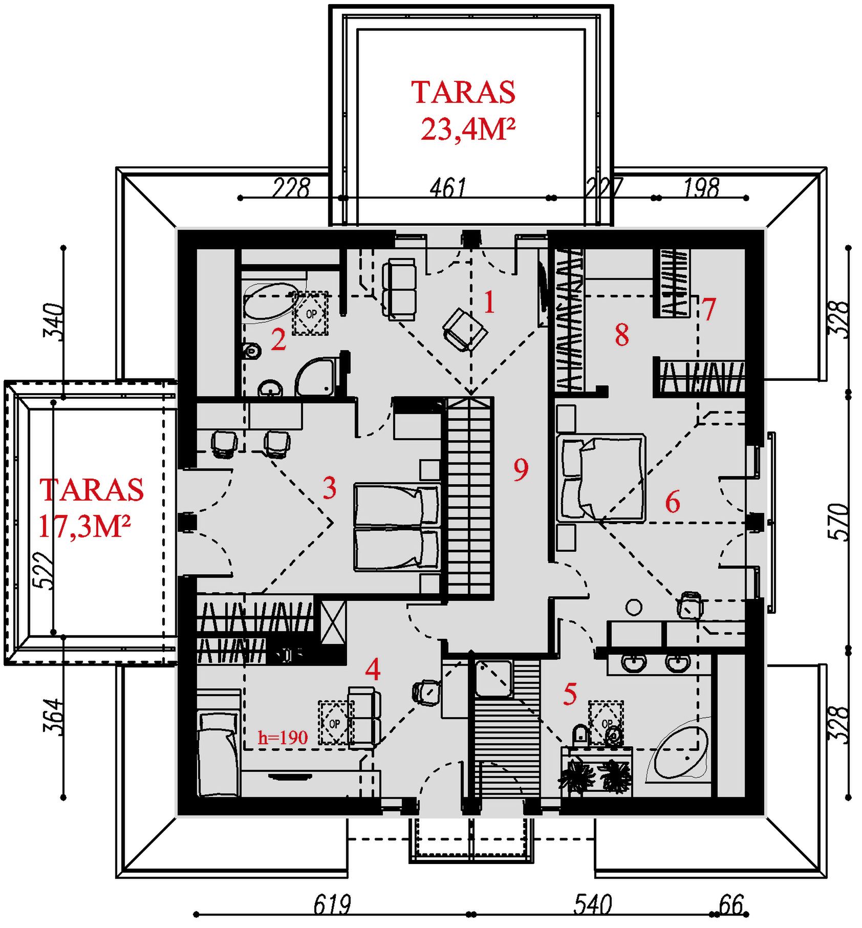 Graficzne opracowanie rzutów poglądowych widocznych na karcie projektu zostało wykonane przez Extradom.pl. Prezentowane przez Extradom.pl wizualizacje wykonane zostały przez autora projektu i należy poczytywać je jedynie za przykład i propozycję wykończenia, wizję architektoniczną autora projektu. Ostateczne wykończenie budynku może nastąpić na wiele sposobów. Szczegółowe rozwiązania zastosowane w oferowanej dokumentacji - w tym również ilość, lokalizacje i wygląd okien, drzwi, kominów - mogą w niewielkim stopniu różnić się od prezentowanej wizualizacji budynku.