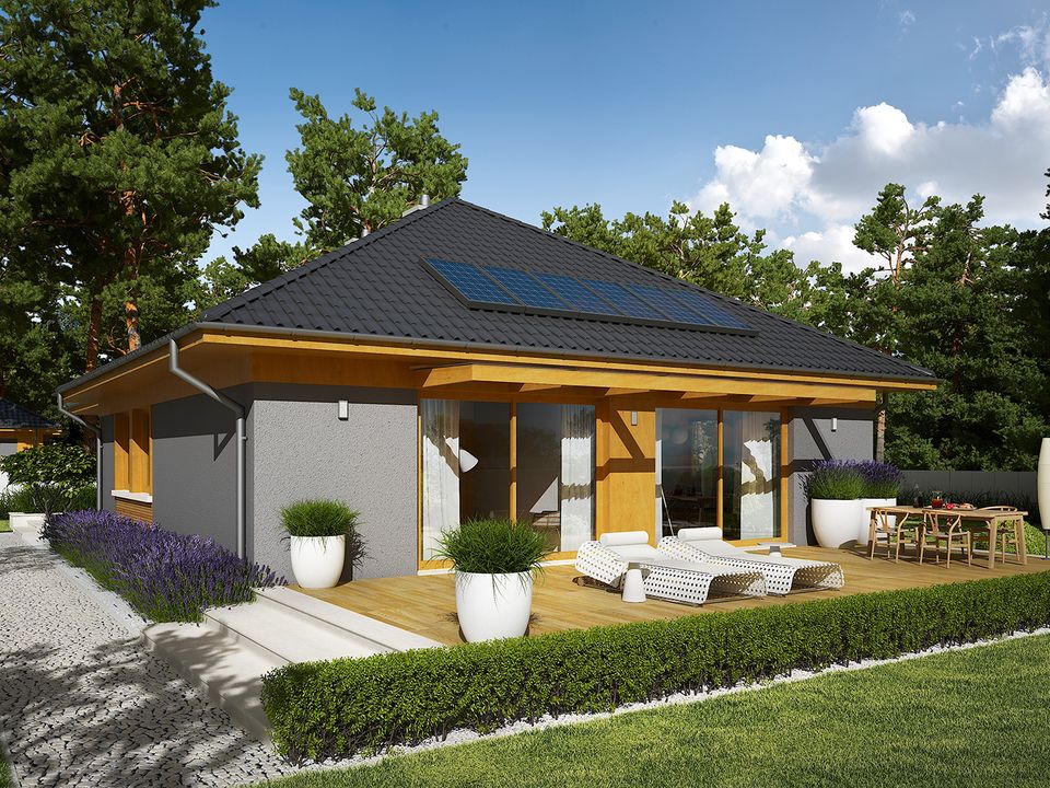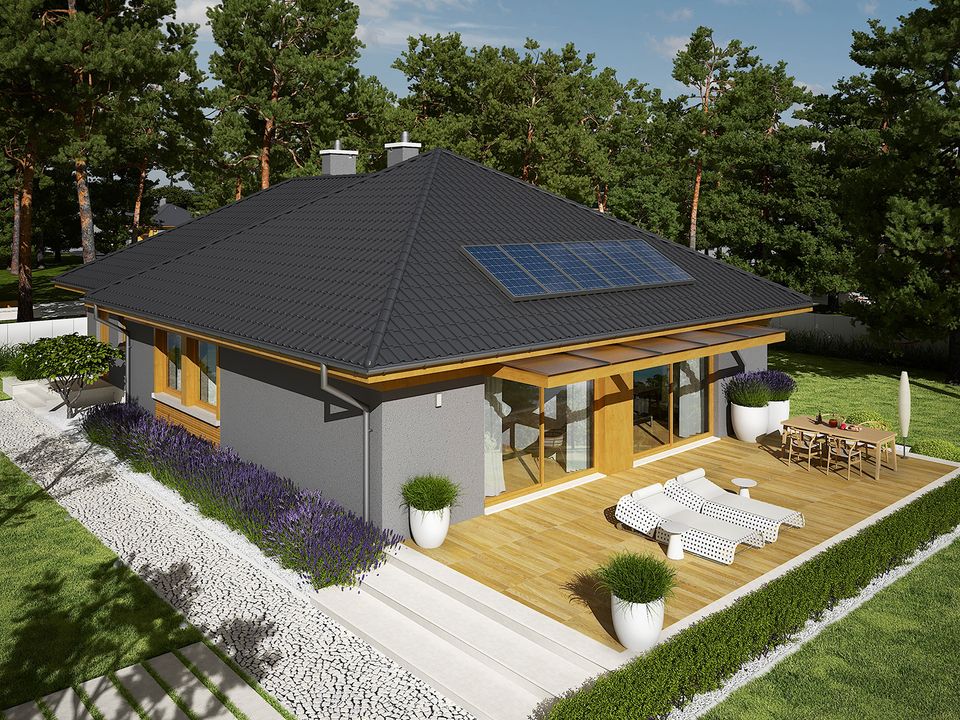Fundamenty: ławy, bloczki betonowe 24 cm, ocieplenie styropian 15 cm. Ściany zewnętrzne: murowane, dwuwarstwowe, beton komórkowy firmy Solbet 24 cm, ocieplenie styropian Termo Organika 20 cm. Ściany wewnętrzne: nośne i działowe murowane, beton komórkowy firmy Solbet 24 cm i 12 cm. Podłoga na gruncie: płyta betonowa, ocieplenie styropian 15 cm. Strop: strop gęstożebrowy Teriva, ocieplenie wełna mineralna firmy Isover 30 cm. Dach: konstrukcja drewniana, dachówka ceramiczna lub cementowa Rozwiązania instalacje. Ogrzewanie: kocioł gazowy kondensacyjny firmy Viessmann, rozprowadzenie ciepła: grzejniki firmy Purmo. Wentylacja: grawitacyjna. OZE: kolektory słoneczne firmy Viessmann. Dodatkowo: stacja uzdatniania wody firmy Viessmann. Elewacje: tynk cienkowarstwowy mineralny z palety firmy Termo Organika i okładzina z płyty HPL z naturalną okleiną drewnianą firmy Prodema. Stolarka: drewniana, PCV lub aluminiowa, rolety zewnętrzne w systemie CleverBox firmy BeClever, drzwi wewnętrzne i wejściowe oraz brama garażowa firmy Hörmann.