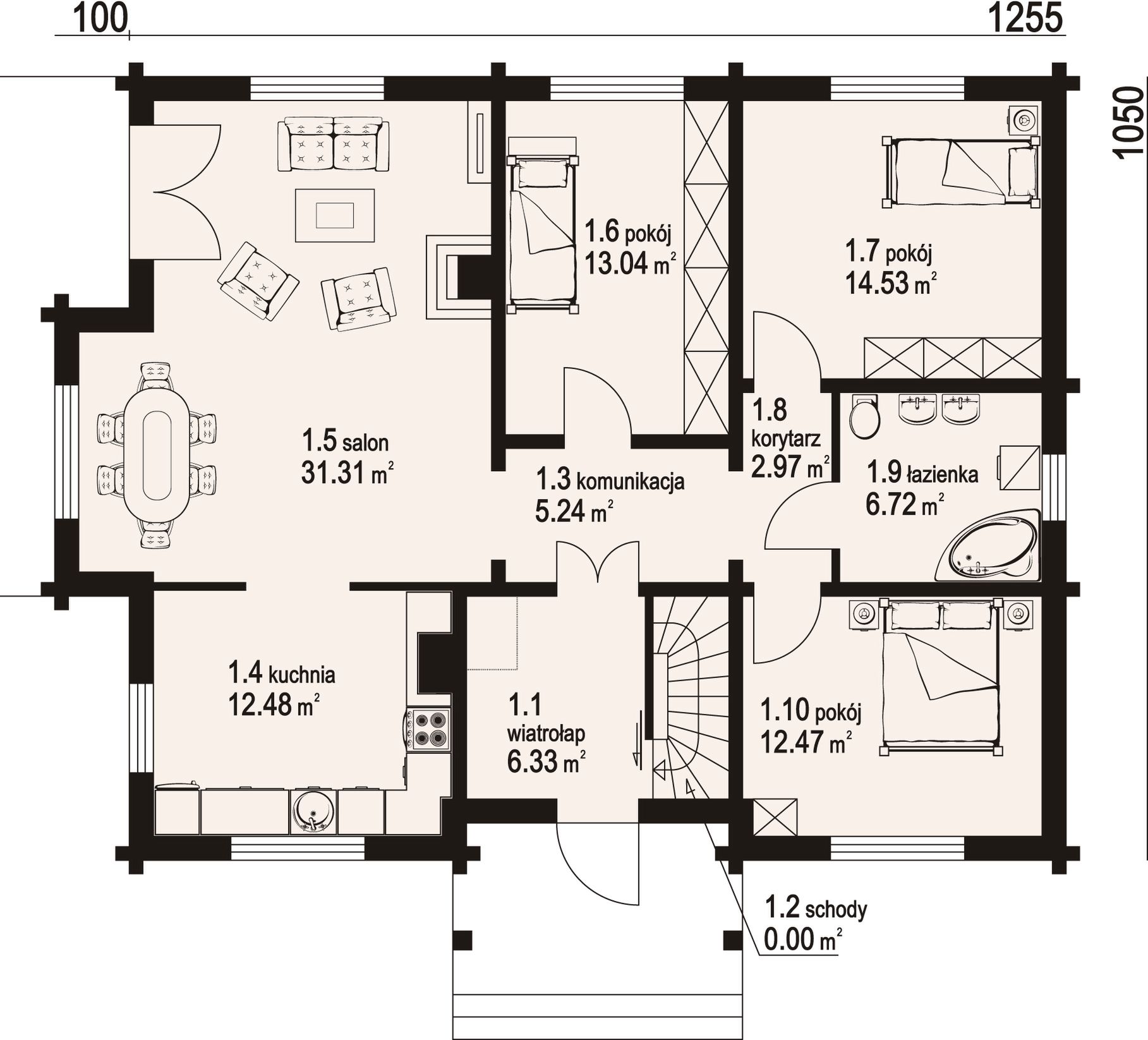 Wys. ścianki kolankowej brak danych Ilość drewna na więźbę 9.77 m³. Strop: drewniany. Pokrycie dachu: dachówka ceramiczna. Ściany wewnętrzne: płazy drewniane. Ściany zewnętrzne: płazy drewniane + wełna mineralna + deska. Typ ogrzewania: kocioł gazowy.