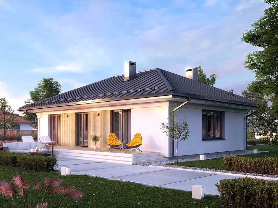 Graficzne opracowanie rzutów poglądowych widocznych na karcie projektu zostało wykonane przez Extradom.pl. Prezentowane przez Extradom.pl wizualizacje wykonane zostały przez autora projektu i należy poczytywać je jedynie za przykład i propozycję wykończenia, wizję architektoniczną autora projektu. Ostateczne wykończenie budynku może nastąpić na wiele sposobów. Szczegółowe rozwiązania zastosowane w oferowanej dokumentacji - w tym również ilość, lokalizacje i wygląd okien, drzwi, kominów - mogą w niewielkim stopniu różnić się od prezentowanej wizualizacji budynku.