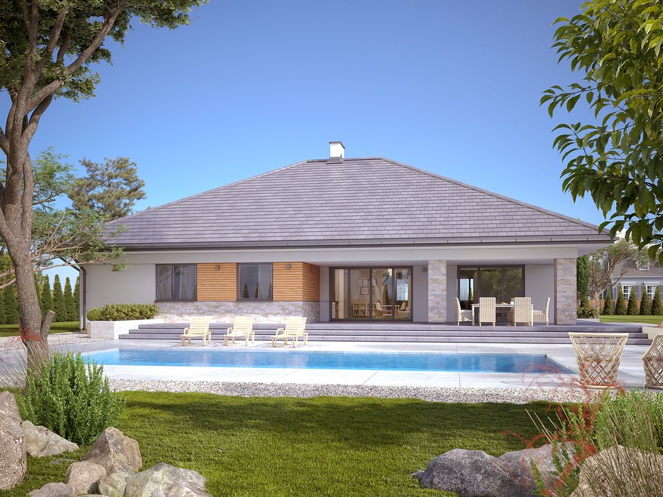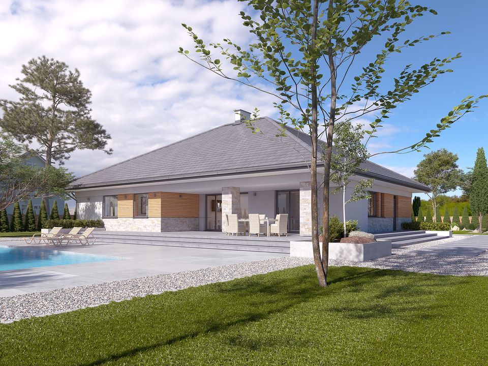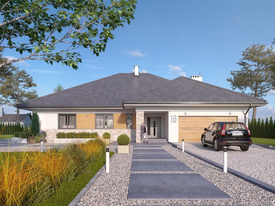 Graficzne opracowanie rzutów poglądowych widocznych na karcie projektu zostało wykonane przez Extradom.pl. Prezentowane przez Extradom.pl wizualizacje wykonane zostały przez autora projektu i należy poczytywać je jedynie za przykład i propozycję wykończenia, wizję architektoniczną autora projektu. Ostateczne wykończenie budynku może nastąpić na wiele sposobów. Szczegółowe rozwiązania zastosowane w oferowanej dokumentacji - w tym również ilość, lokalizacje i wygląd okien, drzwi, kominów - mogą w niewielkim stopniu różnić się od prezentowanej wizualizacji budynku.