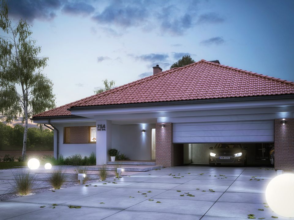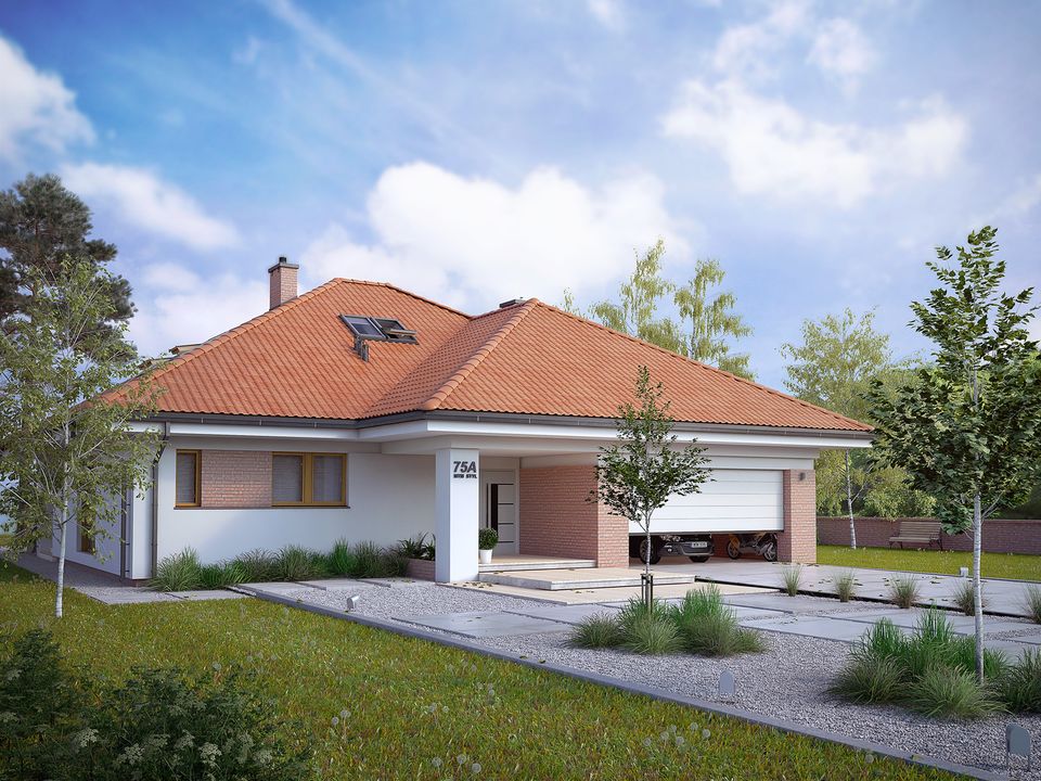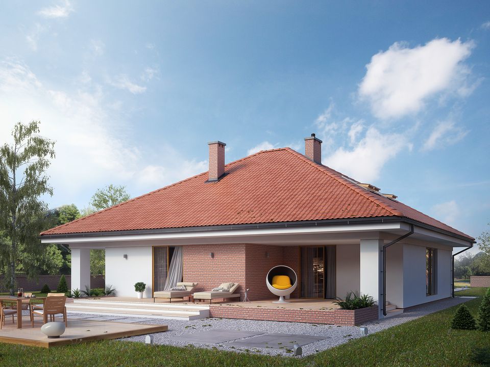 Graficzne opracowanie rzutów poglądowych widocznych na karcie projektu zostało wykonane przez Extradom.pl. Prezentowane przez Extradom.pl wizualizacje wykonane zostały przez autora projektu i należy poczytywać je jedynie za przykład i propozycję wykończenia, wizję architektoniczną autora projektu. Ostateczne wykończenie budynku może nastąpić na wiele sposobów. Szczegółowe rozwiązania zastosowane w oferowanej dokumentacji - w tym również ilość, lokalizacje i wygląd okien, drzwi, kominów - mogą w niewielkim stopniu różnić się od prezentowanej wizualizacji budynku.
