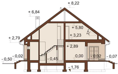 Konstrukcja ściany zewnętrzne - beton komórkowy gr.24cm + styropian Termo Organika Termonium Plus gr. 12cm lub 20cm; ściany wewnetrzne - bloczek silikatowy gr.24cm; ściany fundamentowe - bloczek betonowy; strop - Teriva I; konstrukcja dachu - drewniana Instalacje W projekcie przewidziano instalacjie: c.o. i c.w.u., grzejniki płytowe, instalacje wodno-kanalizacyjna oraz elektryczne, wentylacja grawitacyjna. Wykończenie pokrycie dachowe - dachówka cementowa(w ramach adaptacji inny materiał); ścianki działowe na parterze-bloczki silikatowe; na poddaszu z płyt gipsowo-kartonowych; schody drewniane - zabiegowe ze spocznikami, okna - PVC, okna dachowe i wyłaz dachowy - Fakro. Projekt w fazie koncepcji. Okres oczekiwania: 3 tygodnie od daty zamówienia.