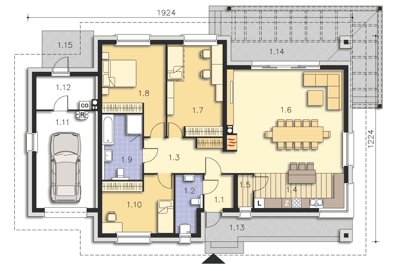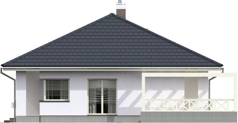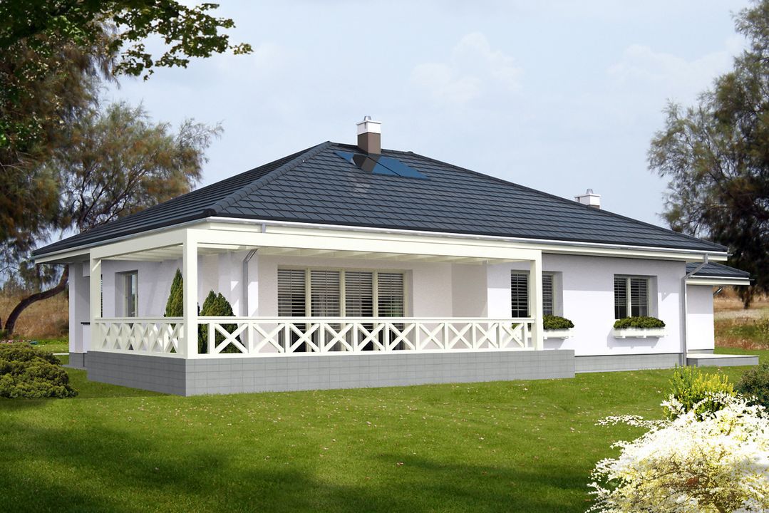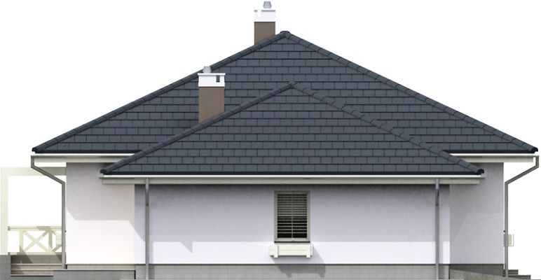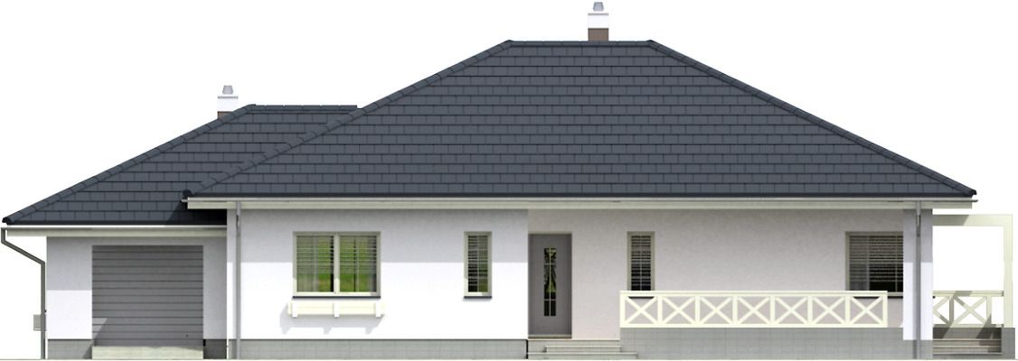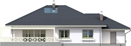 Graficzne opracowanie rzutów poglądowych widocznych na karcie projektu zostało wykonane przez Extradom.pl. Prezentowane przez Extradom.pl wizualizacje wykonane zostały przez autora projektu i należy poczytywać je jedynie za przykład i propozycję wykończenia, wizję architektoniczną autora projektu. Ostateczne wykończenie budynku może nastąpić na wiele sposobów. Szczegółowe rozwiązania zastosowane w oferowanej dokumentacji - w tym również ilość, lokalizacje i wygląd okien, drzwi, kominów - mogą w niewielkim stopniu różnić się od prezentowanej wizualizacji budynku.