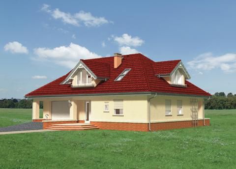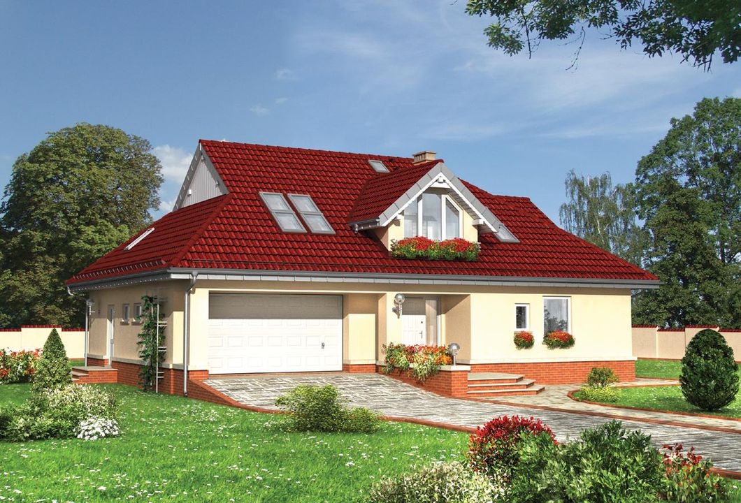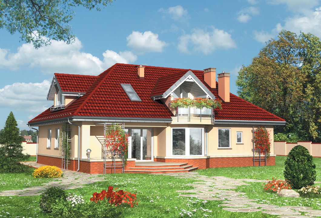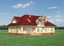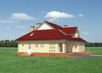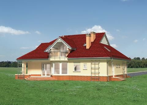 Graficzne opracowanie rzutów poglądowych widocznych na karcie projektu zostało wykonane przez Extradom.pl. Prezentowane przez Extradom.pl wizualizacje wykonane zostały przez autora projektu i należy poczytywać je jedynie za przykład i propozycję wykończenia, wizję architektoniczną autora projektu. Ostateczne wykończenie budynku może nastąpić na wiele sposobów. Szczegółowe rozwiązania zastosowane w oferowanej dokumentacji - w tym również ilość, lokalizacje i wygląd okien, drzwi, kominów - mogą w niewielkim stopniu różnić się od prezentowanej wizualizacji budynku.