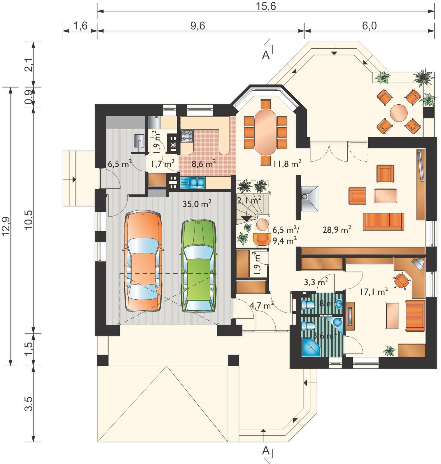 Technologia i konstrukcja: murowana – beton komórkowy. Ściany zewnętrzne: bloczki Ytong gr. 40. Ściany wewnętrzne: konstrukcyjne: bloczki Silka E gr. 24 oraz system suchej zabudowy Fermacell na poddaszu; działowe: bloczki Silka E gr. 12 cm. Strop: żelbetowy. Konstrukcja dachu: drewniana, mieszana. Rodzaj schodów: żelbetowe. Typ ogrzewania: kocioł na gaz. Aneks na paliwo stałe: na zamówienie. Pokrycie dachu: dachówka cementowa. Elewacja: tynk w systemie Maxit.