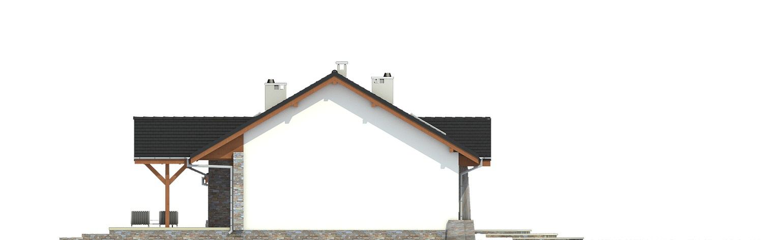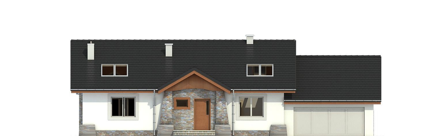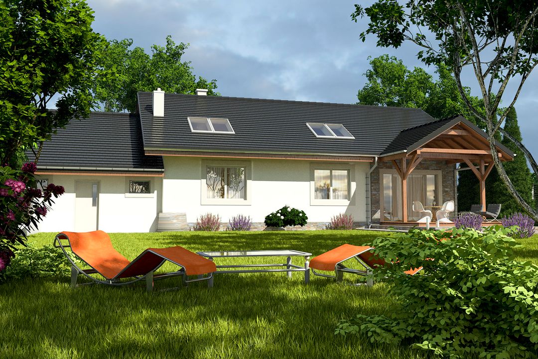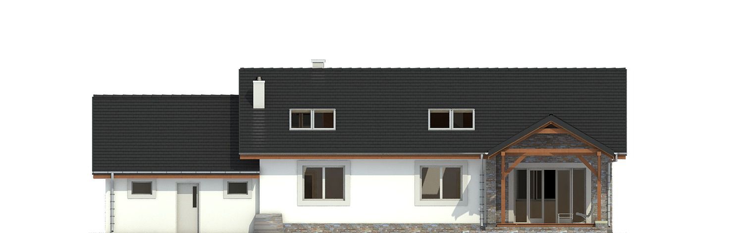 Graficzne opracowanie rzutów poglądowych widocznych na karcie projektu zostało wykonane przez Extradom.pl. Prezentowane przez Extradom.pl wizualizacje wykonane zostały przez autora projektu i należy poczytywać je jedynie za przykład i propozycję wykończenia, wizję architektoniczną autora projektu. Ostateczne wykończenie budynku może nastąpić na wiele sposobów. Szczegółowe rozwiązania zastosowane w oferowanej dokumentacji - w tym również ilość, lokalizacje i wygląd okien, drzwi, kominów - mogą w niewielkim stopniu różnić się od prezentowanej wizualizacji budynku.