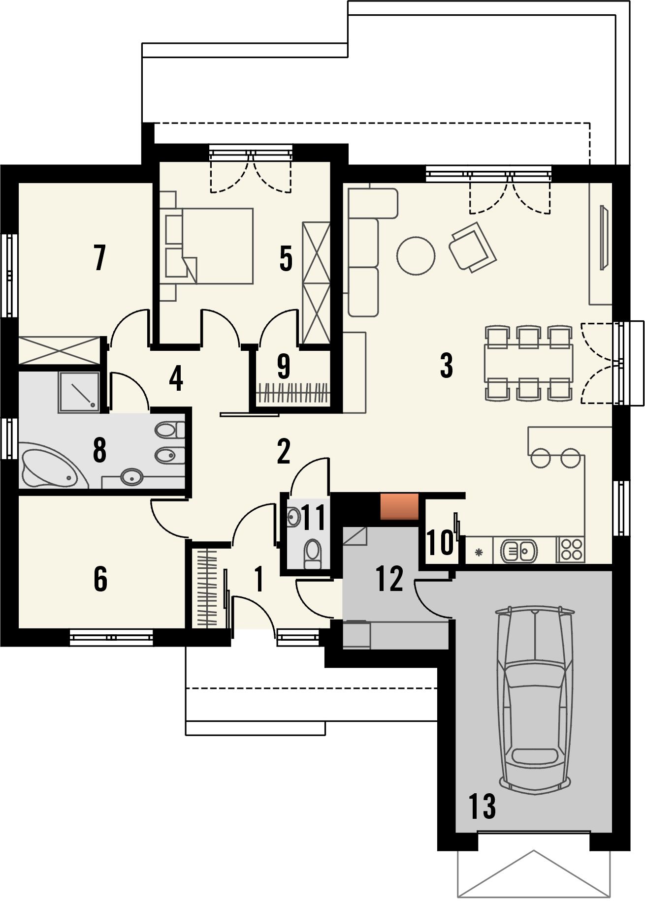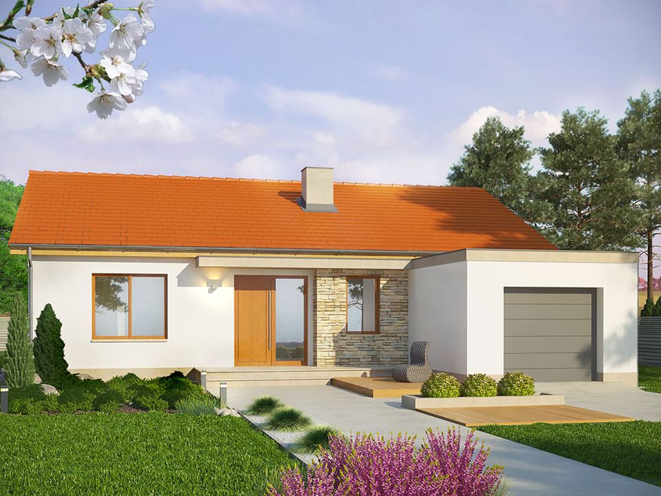 Graficzne opracowanie rzutów poglądowych widocznych na karcie projektu zostało wykonane przez Extradom.pl. Prezentowane przez Extradom.pl wizualizacje wykonane zostały przez autora projektu i należy poczytywać je jedynie za przykład i propozycję wykończenia, wizję architektoniczną autora projektu. Ostateczne wykończenie budynku może nastąpić na wiele sposobów. Szczegółowe rozwiązania zastosowane w oferowanej dokumentacji - w tym również ilość, lokalizacje i wygląd okien, drzwi, kominów - mogą w niewielkim stopniu różnić się od prezentowanej wizualizacji budynku.