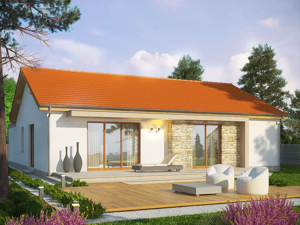 Ściany przewidziano z gazobetonu docieplonego styropianem. Sufit podwieszony jest do drewnianej więźby. Dach można przekryć dachówką ceramiczną albo betonową. Elewacje tynkowane, częściowo obłożone płytkami kamiennymi lub klinkierowymi. Materiały budowlane wymienić można na inne na etapie adaptacji.