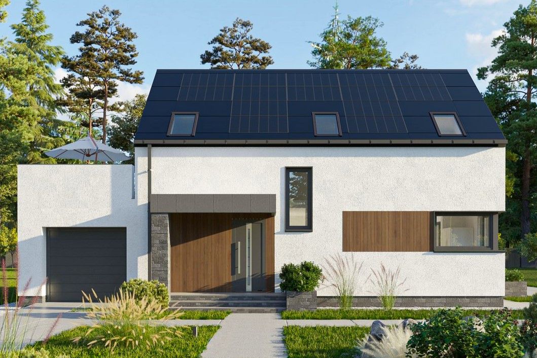 Wersja technologiczna: murowana - beton komórkowy. Izolacja termiczna ścian zewnętrznych: styropian TERMONIUM FASADA firmy TERMO ORGANIKA. Strop: żelbetowy monolityczny. Typ schodów: płytowe żelbetowe. Konstrukcja dachu: drewniana krokwiowo-jętkowa. Pokrycie dachowe: dach solarny w systemie MyRoof z panelami PV 370W FULLBLACK, część nieaktywna poszycia dachu wykonana z kompozytu aluminiowego firmy mdm NT. Typ ogrzewania: pompa ciepła. Wentylacja: mechaniczna. Ściany zewnętrzne: 24 cm beton komórkowy Solbet Optimal. Ściany wewnętrzne: 24 cm beton komórkowy Solbet Optimal. Ściany wewnętrzne działowe: 12 cm beton komórkowy Solbet Optimal. Wentylacja: mechaniczna Heatpex Aria.