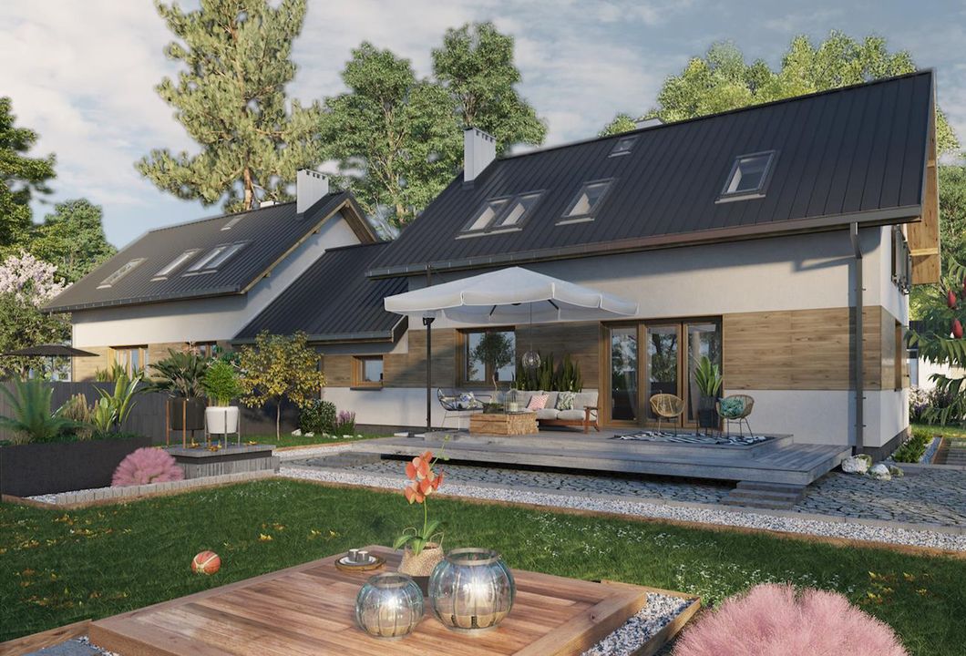 Graficzne opracowanie rzutów poglądowych widocznych na karcie projektu zostało wykonane przez Extradom.pl. Prezentowane przez Extradom.pl wizualizacje wykonane zostały przez autora projektu i należy poczytywać je jedynie za przykład i propozycję wykończenia, wizję architektoniczną autora projektu. Ostateczne wykończenie budynku może nastąpić na wiele sposobów. Szczegółowe rozwiązania zastosowane w oferowanej dokumentacji - w tym również ilość, lokalizacje i wygląd okien, drzwi, kominów - mogą w niewielkim stopniu różnić się od prezentowanej wizualizacji budynku.