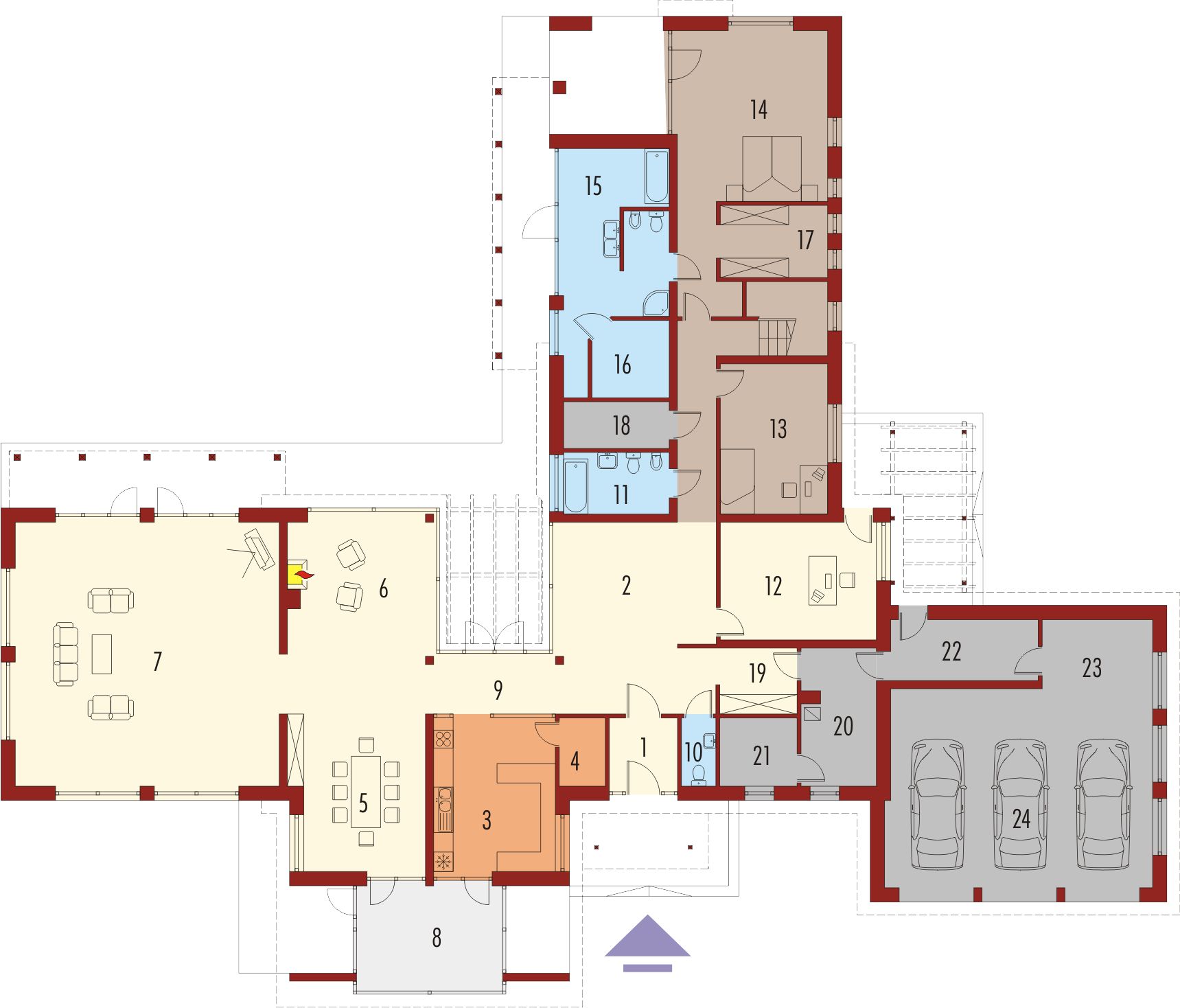 Graficzne opracowanie rzutów poglądowych widocznych na karcie projektu zostało wykonane przez Extradom.pl. Prezentowane przez Extradom.pl wizualizacje wykonane zostały przez autora projektu i należy poczytywać je jedynie za przykład i propozycję wykończenia, wizję architektoniczną autora projektu. Ostateczne wykończenie budynku może nastąpić na wiele sposobów. Szczegółowe rozwiązania zastosowane w oferowanej dokumentacji - w tym również ilość, lokalizacje i wygląd okien, drzwi, kominów - mogą w niewielkim stopniu różnić się od prezentowanej wizualizacji budynku.