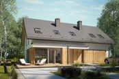 Graficzne opracowanie rzutów poglądowych widocznych na karcie projektu zostało wykonane przez Extradom.pl. Prezentowane przez Extradom.pl wizualizacje wykonane zostały przez autora projektu i należy poczytywać je jedynie za przykład i propozycję wykończenia, wizję architektoniczną autora projektu. Ostateczne wykończenie budynku może nastąpić na wiele sposobów. Szczegółowe rozwiązania zastosowane w oferowanej dokumentacji - w tym również ilość, lokalizacje i wygląd okien, drzwi, kominów - mogą w niewielkim stopniu różnić się od prezentowanej wizualizacji budynku.