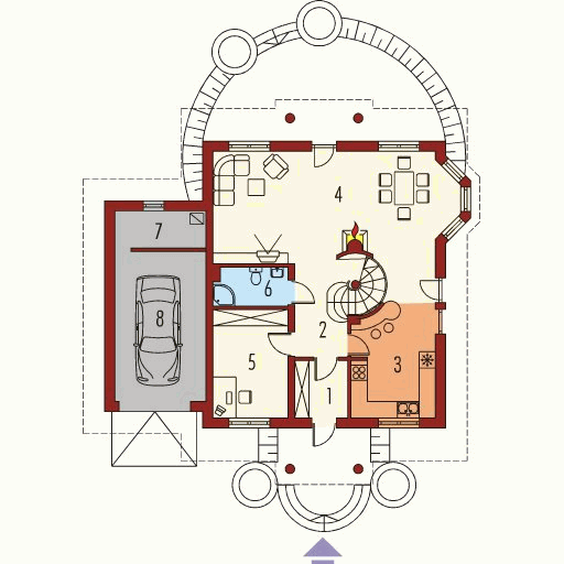 Graficzne opracowanie rzutów poglądowych widocznych na karcie projektu zostało wykonane przez Extradom.pl. Prezentowane przez Extradom.pl wizualizacje wykonane zostały przez autora projektu i należy poczytywać je jedynie za przykład i propozycję wykończenia, wizję architektoniczną autora projektu. Ostateczne wykończenie budynku może nastąpić na wiele sposobów. Szczegółowe rozwiązania zastosowane w oferowanej dokumentacji - w tym również ilość, lokalizacje i wygląd okien, drzwi, kominów - mogą w niewielkim stopniu różnić się od prezentowanej wizualizacji budynku.