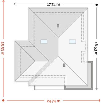 Graficzne opracowanie rzutów poglądowych widocznych na karcie projektu zostało wykonane przez Extradom.pl. Prezentowane przez Extradom.pl wizualizacje wykonane zostały przez autora projektu i należy poczytywać je jedynie za przykład i propozycję wykończenia, wizję architektoniczną autora projektu. Ostateczne wykończenie budynku może nastąpić na wiele sposobów. Szczegółowe rozwiązania zastosowane w oferowanej dokumentacji - w tym również ilość, lokalizacje i wygląd okien, drzwi, kominów - mogą w niewielkim stopniu różnić się od prezentowanej wizualizacji budynku.