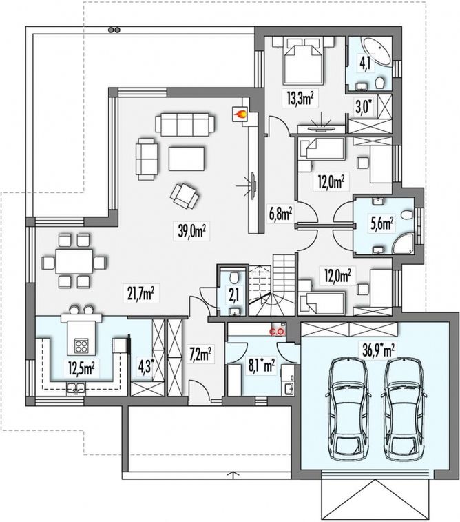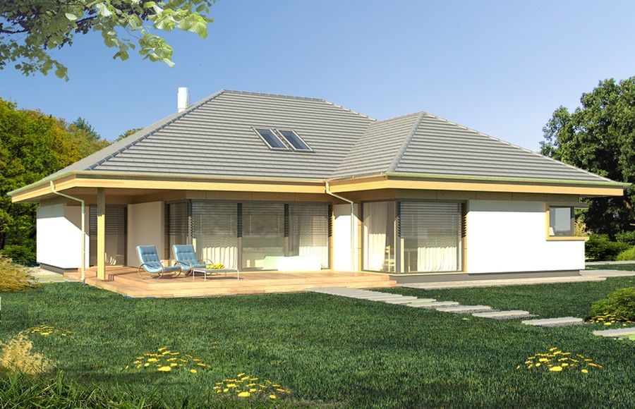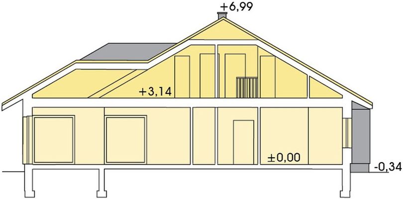 Graficzne opracowanie rzutów poglądowych widocznych na karcie projektu zostało wykonane przez Extradom.pl. Prezentowane przez Extradom.pl wizualizacje wykonane zostały przez autora projektu i należy poczytywać je jedynie za przykład i propozycję wykończenia, wizję architektoniczną autora projektu. Ostateczne wykończenie budynku może nastąpić na wiele sposobów. Szczegółowe rozwiązania zastosowane w oferowanej dokumentacji - w tym również ilość, lokalizacje i wygląd okien, drzwi, kominów - mogą w niewielkim stopniu różnić się od prezentowanej wizualizacji budynku.