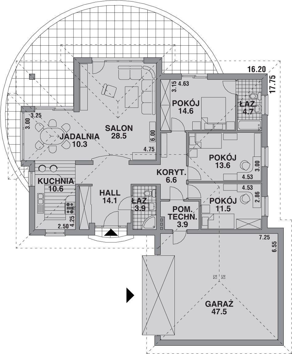 Graficzne opracowanie rzutów poglądowych widocznych na karcie projektu zostało wykonane przez Extradom.pl. Prezentowane przez Extradom.pl wizualizacje wykonane zostały przez autora projektu i należy poczytywać je jedynie za przykład i propozycję wykończenia, wizję architektoniczną autora projektu. Ostateczne wykończenie budynku może nastąpić na wiele sposobów. Szczegółowe rozwiązania zastosowane w oferowanej dokumentacji - w tym również ilość, lokalizacje i wygląd okien, drzwi, kominów - mogą w niewielkim stopniu różnić się od prezentowanej wizualizacji budynku.